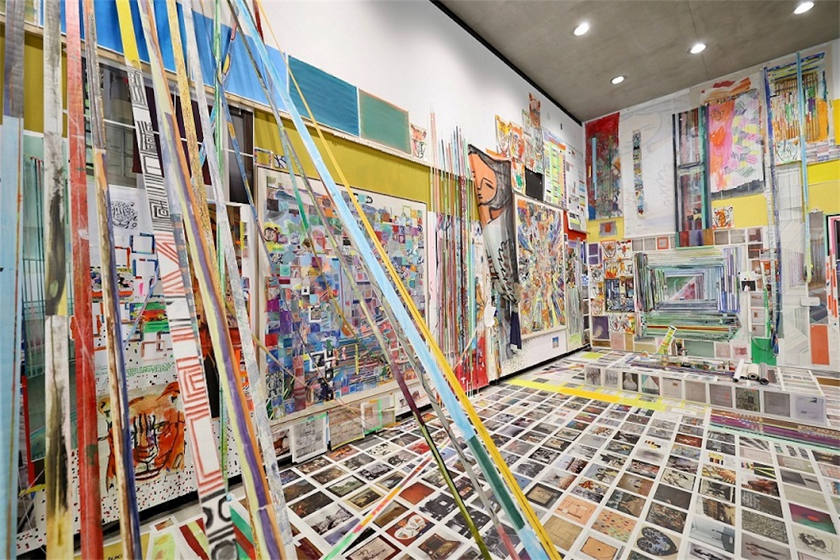 Access to the exhibition is a total immersion in the studio of the American artist Franklin Evans with the work perpetualstudio, created especially for MAXXI: a physical, material and non-digital data room, inhabited by canvases, drawings, prints, photographs, quotations, texts, adhesive tapes and various elements that narrate the artist’s research and make us enter a fluid, colourful and wonderful world.