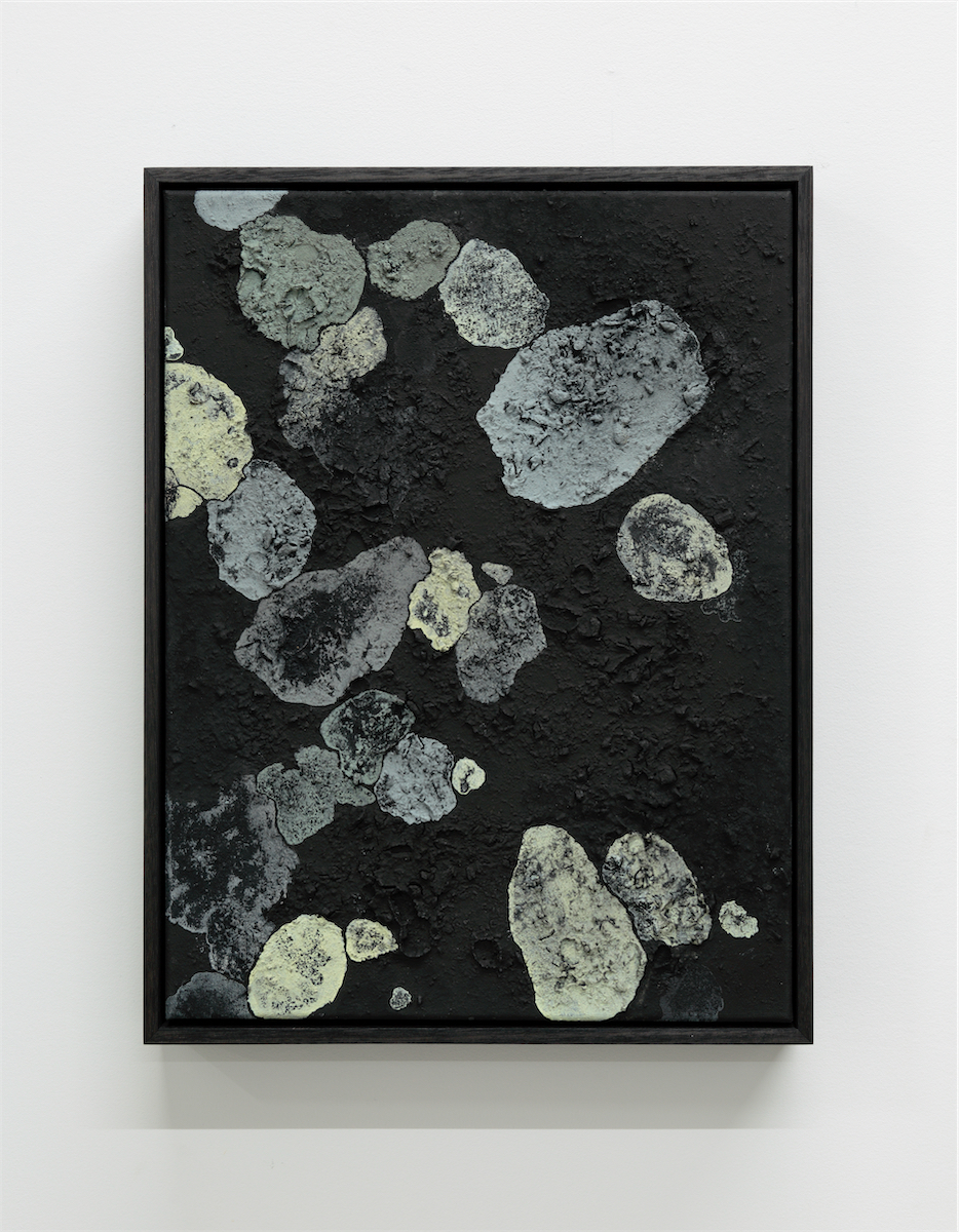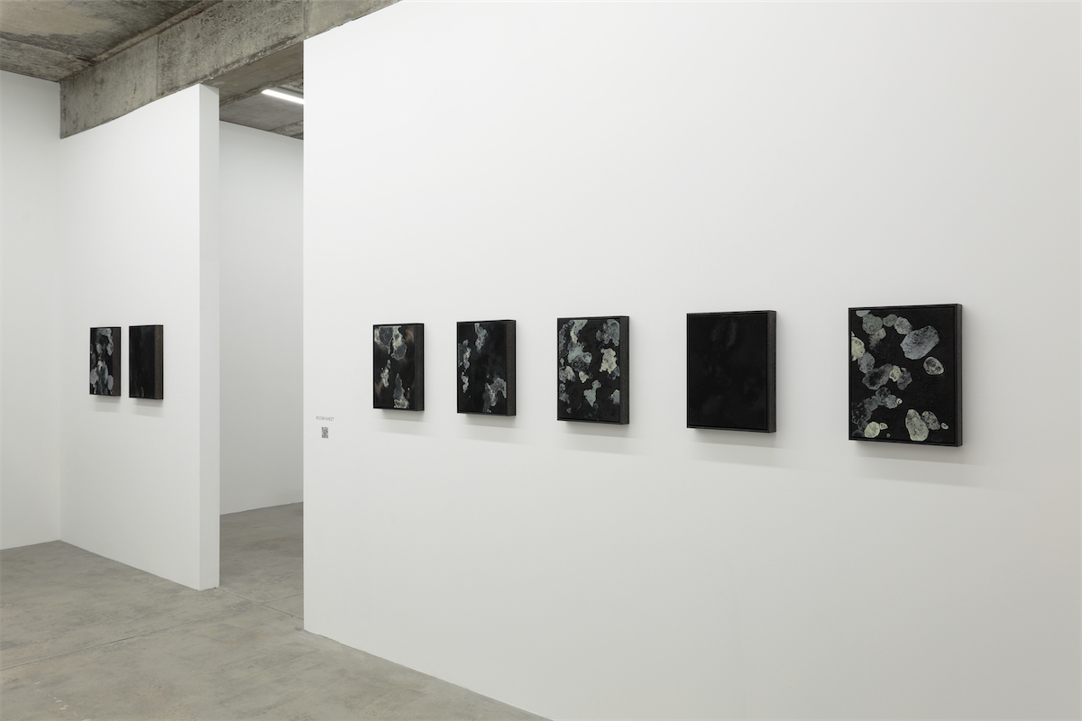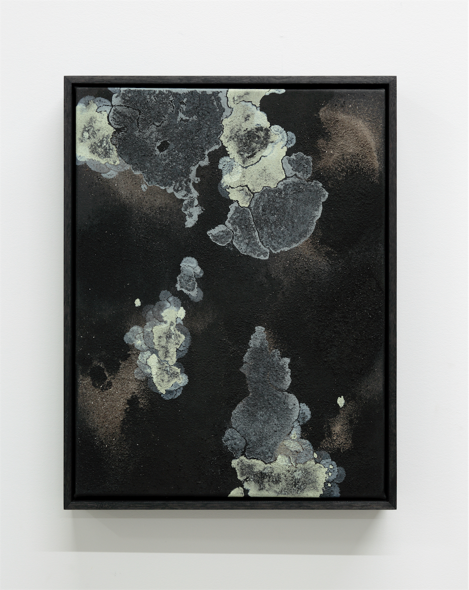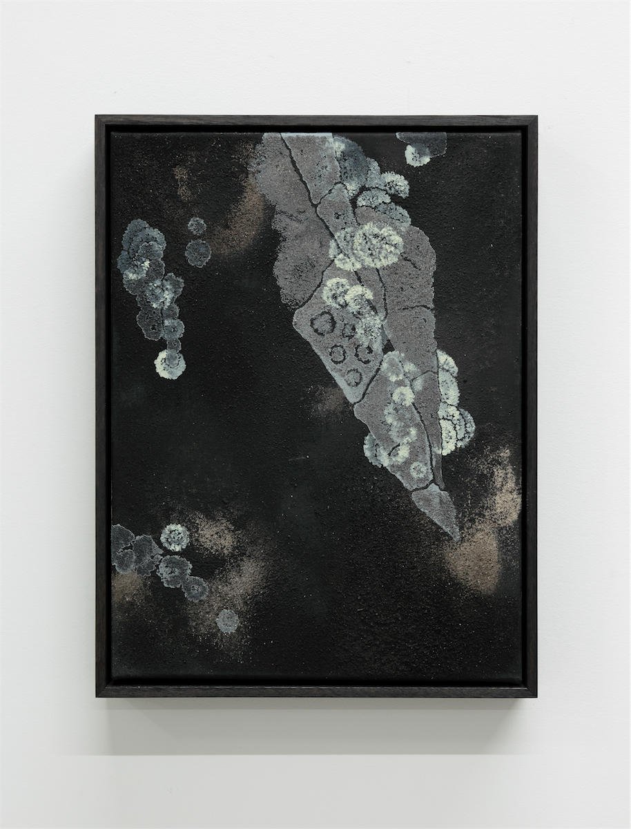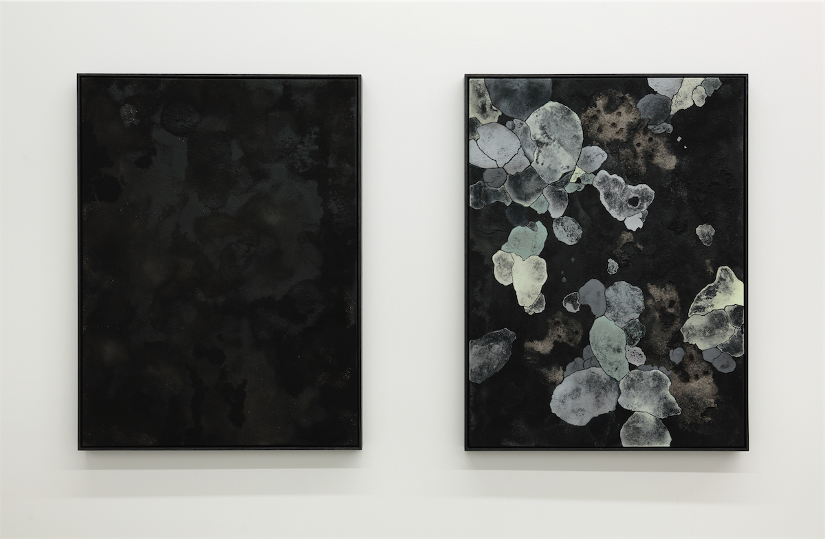 For Time Machine Bae and Lawler draw on the fascinating life of lichen, its unique symbiotic relationship with our environment, and its role as a bio-indicator. Their works emphasise repetition and transformation, combining charcoal, ash, synthetic polymers to create highly textured, patterned surfaces. Bae and Lawler draw on references from the microcosmic patterns of the natural world, to create works that take on a macrocosmic state.