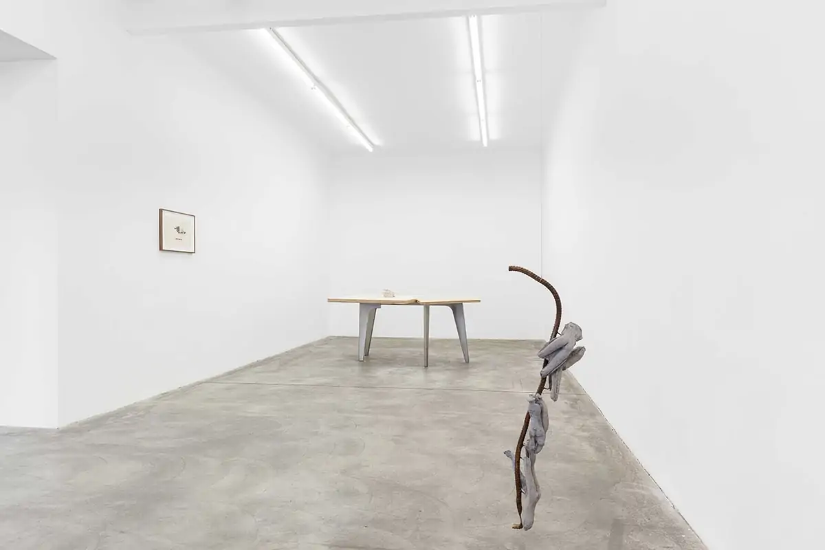 The notion of an interior charged with subjective particles of experience is also found in Forager — Dessert (2020): A table with two interlocking surfaces provides the display for a still life-like plaster sculpture of cast Romanesco cauliflower and coral. It looks like a snapshot of the ocean floor turned to stone for indoor space, jetsam immortalising nature. Alongside small cement figurines, which are symbolically reduced human bodies winding along a deformed rod of steel (Flesh in Stone — Ghost No. 10, 2020), there is a curved plate of stainless steel as the support for a silkscreened print of a forest view (Refined Still Life No. 9, 2021). Nature becomes decoration, the echo of the natural experience but also an abstract memory as an image that has imprinted itself through the gestures of bodily experiences: an unseen gesture that has actually become an absent one here while still reverberating in the space.