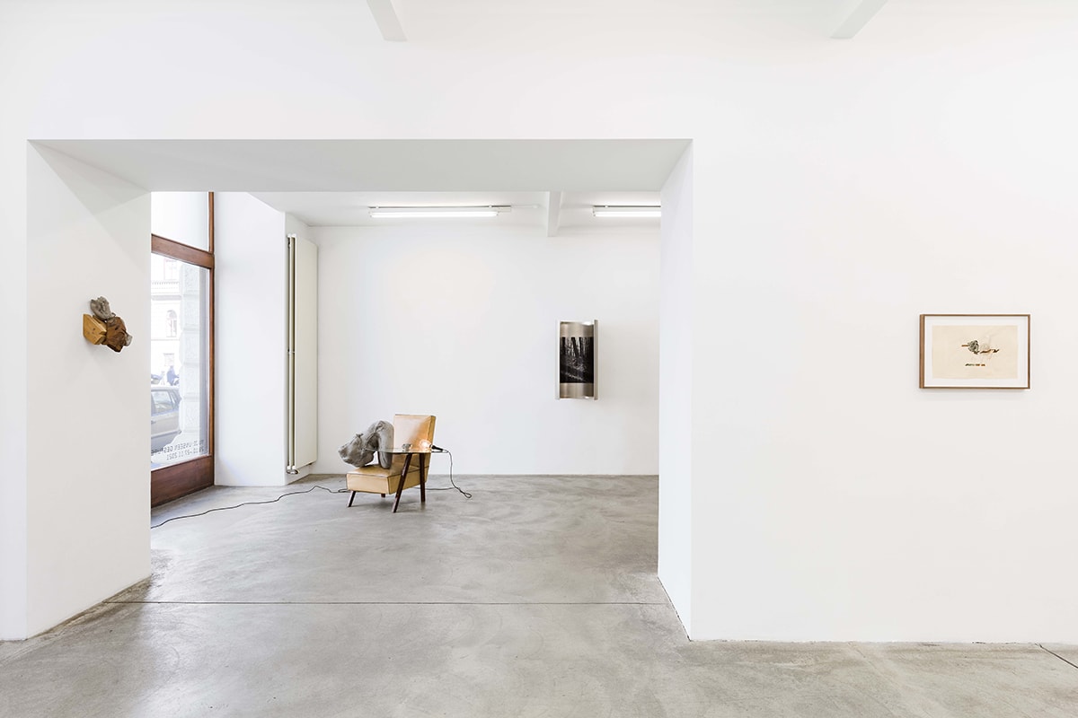She also engages with the deliberate positioning of performative elements in her series Flesh in Stone, where different sized cement casts of parts of the body, fragmented or in motion, form around elements of iron or wood and engage in a charged relationship with them. Flesh in Stone — Ghost No. 7 (2020) shows a torso and fragments that are abstract or reminiscent of bodies, supported on pieces of wood that themselves seem to have come from the past. While Flesh in Stone — Ghost No. 9 (2021) reduces the anthropomorphic cement figure to an elementary shape that is more the frozen notion of movement than a defined body, cut into by panes of old mirror glass and seated on a vintage armchair. This dissociated figure has the look of a human being still in the process of becoming one.