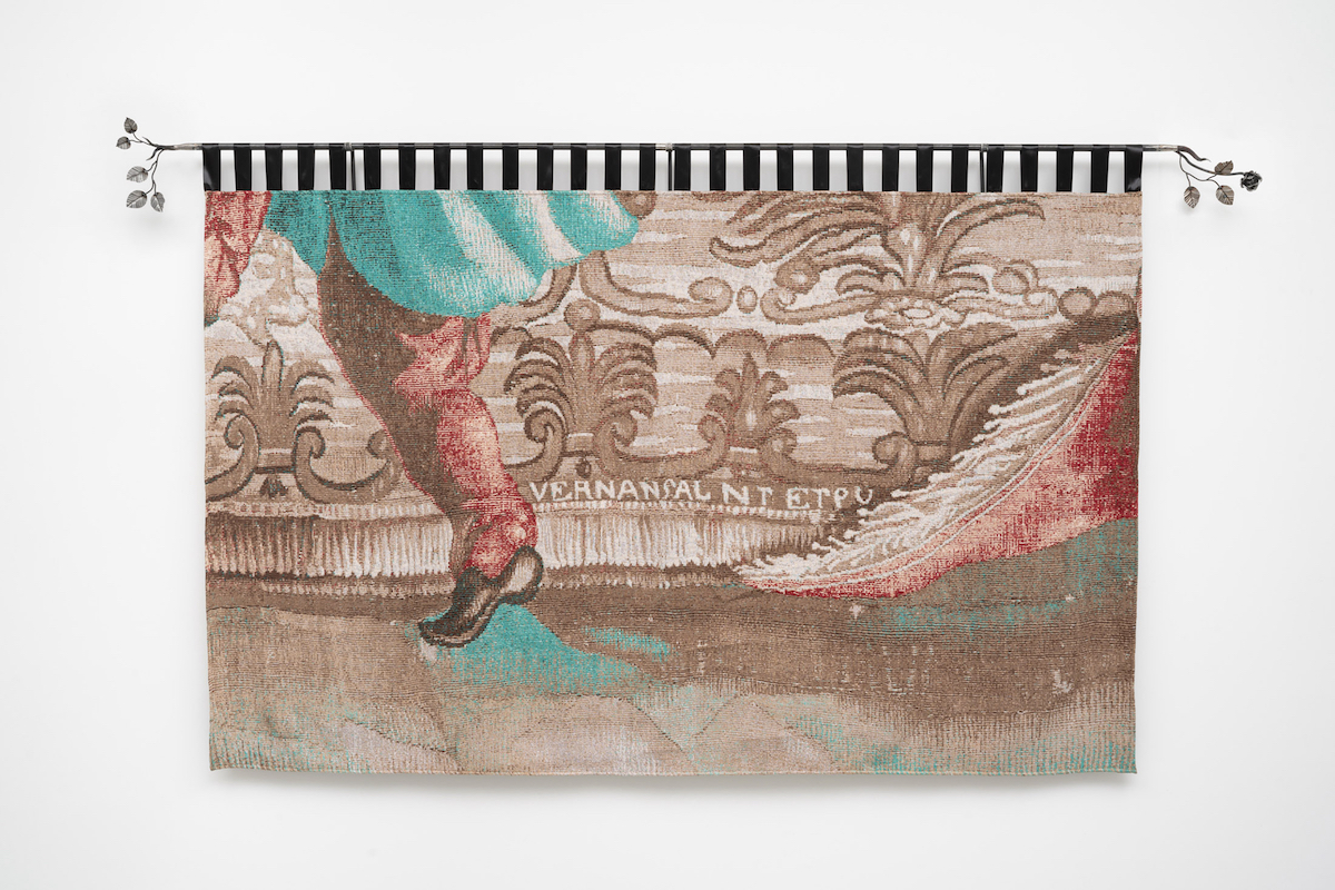As with other previous works, Czebatul dips once more into art history to capture our present conditions. The images represented on each textile work are blown-up details of ancient tapestries, dating from the Middle Ages to roughly AD 1600. These close-ups are concentrated on the lower parts of the compositions, at times allowing a glimpse of a foot, a fetishist motif with a long iconographic tradition. For Czebatul, who previously reproduced the foot of the sculpture of the Bismarck national monument in Berlin’s Tiergarten, the foot is a symbol of patriarchal power and systemic violence. It’s also an image of mobility, not only that of bodies, but also that of cultures, knowledges, and crafts, as exemplified by the art of tapestry, a medium that circulated throughout Europe and beyond, hybridizing along the way. The enlargements focus the gaze on details of robes or draperies, which creates an illusion of volume and provokes a sort of mise en abyme effect, of textile represented by textile.