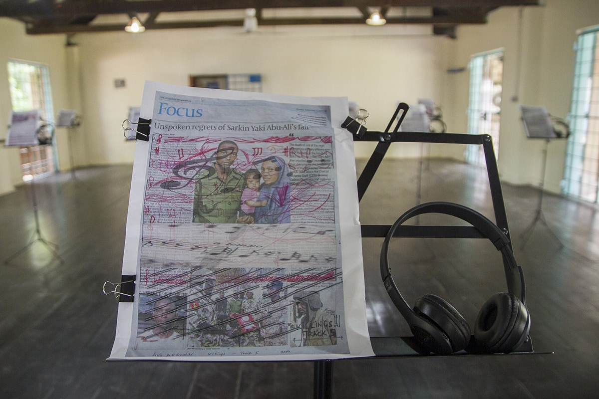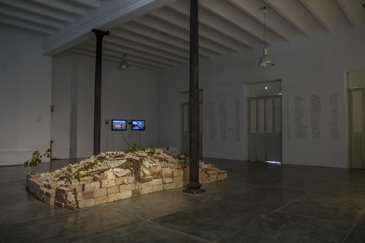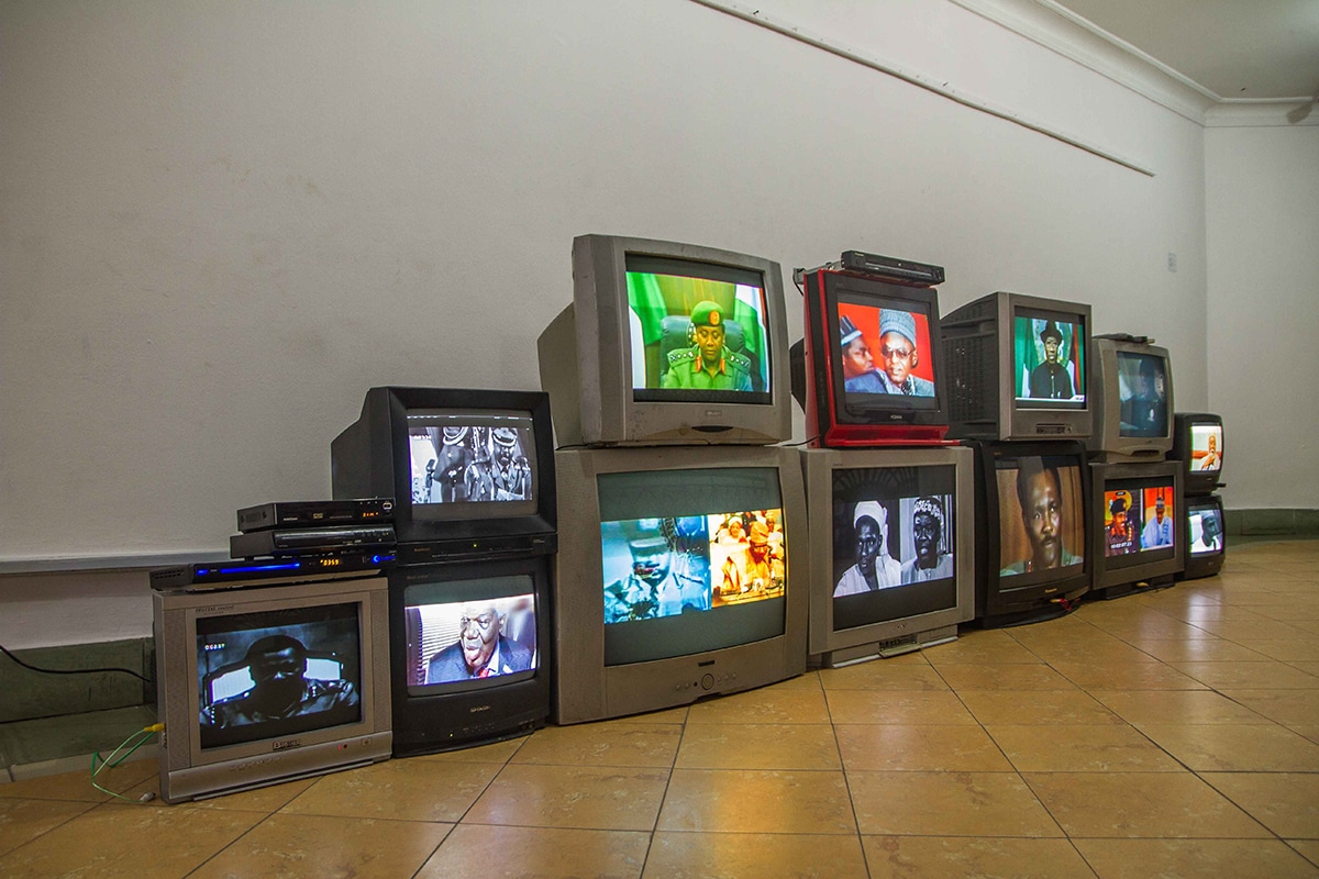 Ayọ̀ Akínwándé - Southern Kaduna 2019, Installation, text, bricks, debris, foliage, wood, metal; Video with audio, 23min & 18minAyọ̀ Akínwándé - Vagabonds in Power, 2018 | Power Show II: The God-Fathers Are Not To Blame | Curated by Njideka Iroh at Revolving Art Incubator, Lagos | Video, Cathode Ray TVs, DVDs, archival footage | Dimensions VaryAyọ̀ Akínwándé - The People’s Parliament, 2019 | Steel rods, corrogated plastic, laser print on vinyl of archives, soundAyọ̀ Akínwándé - Onípáánù I 2019, Installation, corrugated zinc sheet, steel, metal chainAyọ̀ Akínwándé - Mumu LP Vol 3: The Listening Room; The Little Theatre Club, Mombasa (Kenya)Ayọ̀ Akínwándé - Mumu LP Vol 3: The Listening Room; The Little Theatre Club, Mombasa (Kenya)Ayọ̀ Akínwándé - Southern Kaduna 2019, Photograph (included within one of five limited edition photo log books, displayed on plinths)