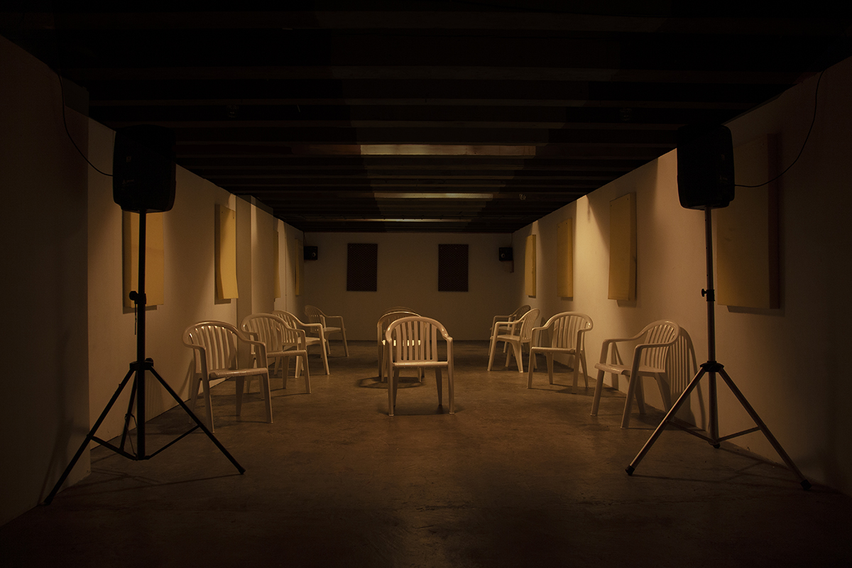 Lowered ceiling, concealing 40 transducer speakers playing the sound of rain. Installed in the group exhibition, Under Bat Hill, at W139 (Amsterdam) Mural by Holly Mills.
