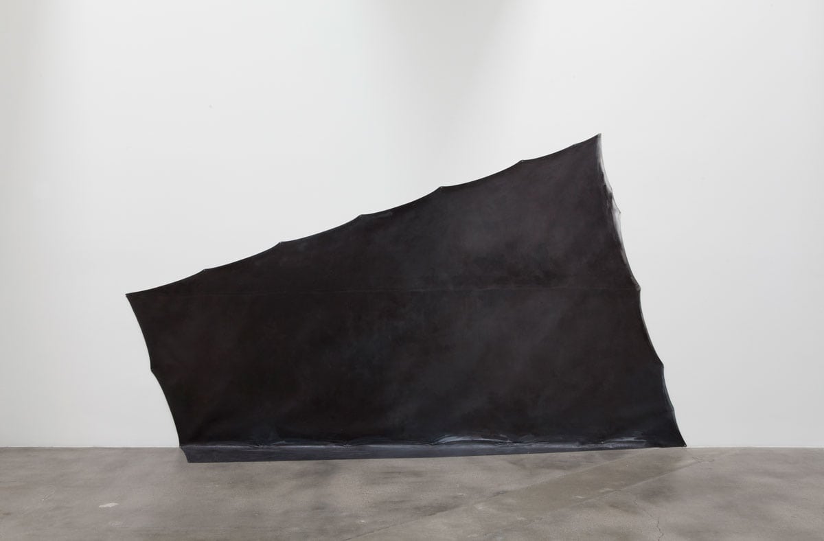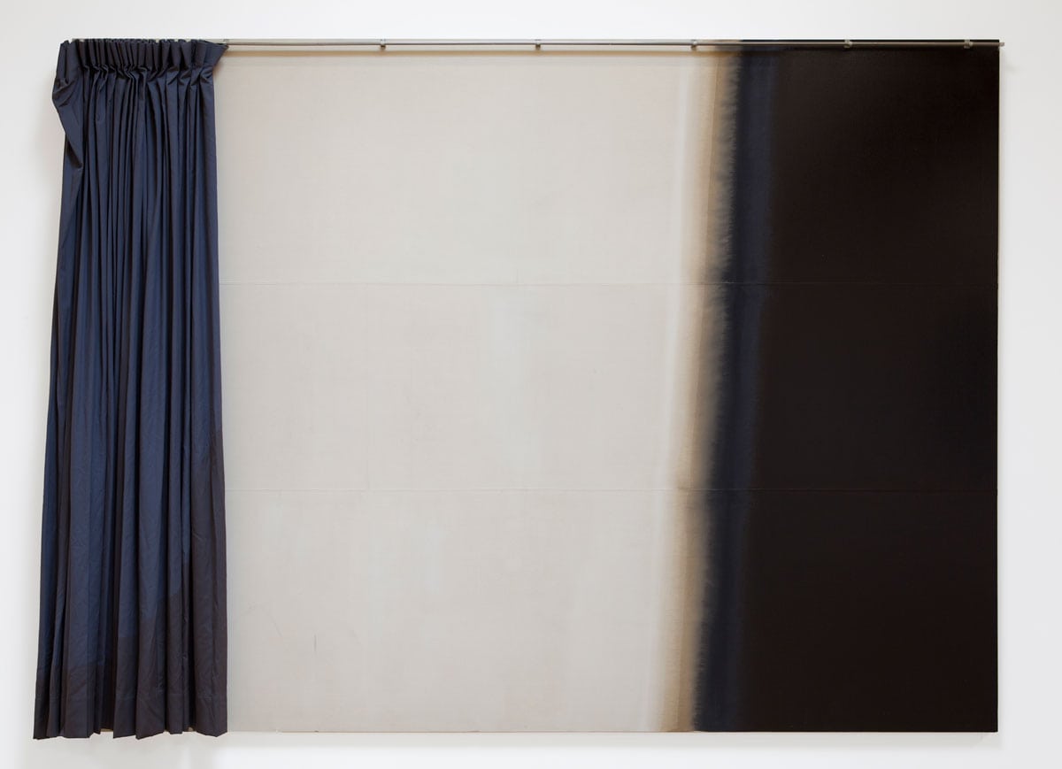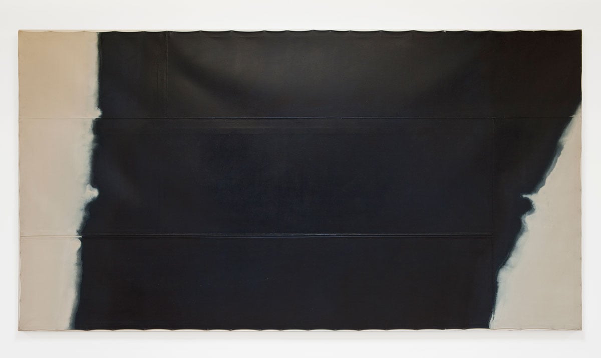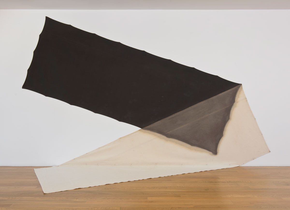 At the end of the 1960s, Kōji Enokura became associated with a loose group of artists who collectively came to be known as Mono-ha (“school of things”). Their ephemeral, site- specific work explored natural and industrial materials, examining their respective material qualities and the interdependent relationships generated by specific placements within a space. Enokura created one of his most iconic installations at the Paris Youth Biennale: Wall (1971), a three-meter-tall and five-meter-wide concrete partition between two trees in the Parc Floral de Paris. Throughout the first half of the 1970s, Enokura stained paper, cloth, felt, and leather with oil and grease. He also discolored the floors and walls of galleries and outdoor spaces. Though no longer extant, these installations are documented in photographs. During the 1980s and 1990s, Enokura continued to explore the act of staining on cotton fabric. In these works, the artist variously contrasts smooth fields of black paint with unpainted fabric, drenches the entire surface, or uses oil-soaked beams of lumber to mark the fabric—either affixing the beams to the work or leaning them against it. Enokura is also known for his signature fabrics hung diagonally on the wall and folding out onto the floor.