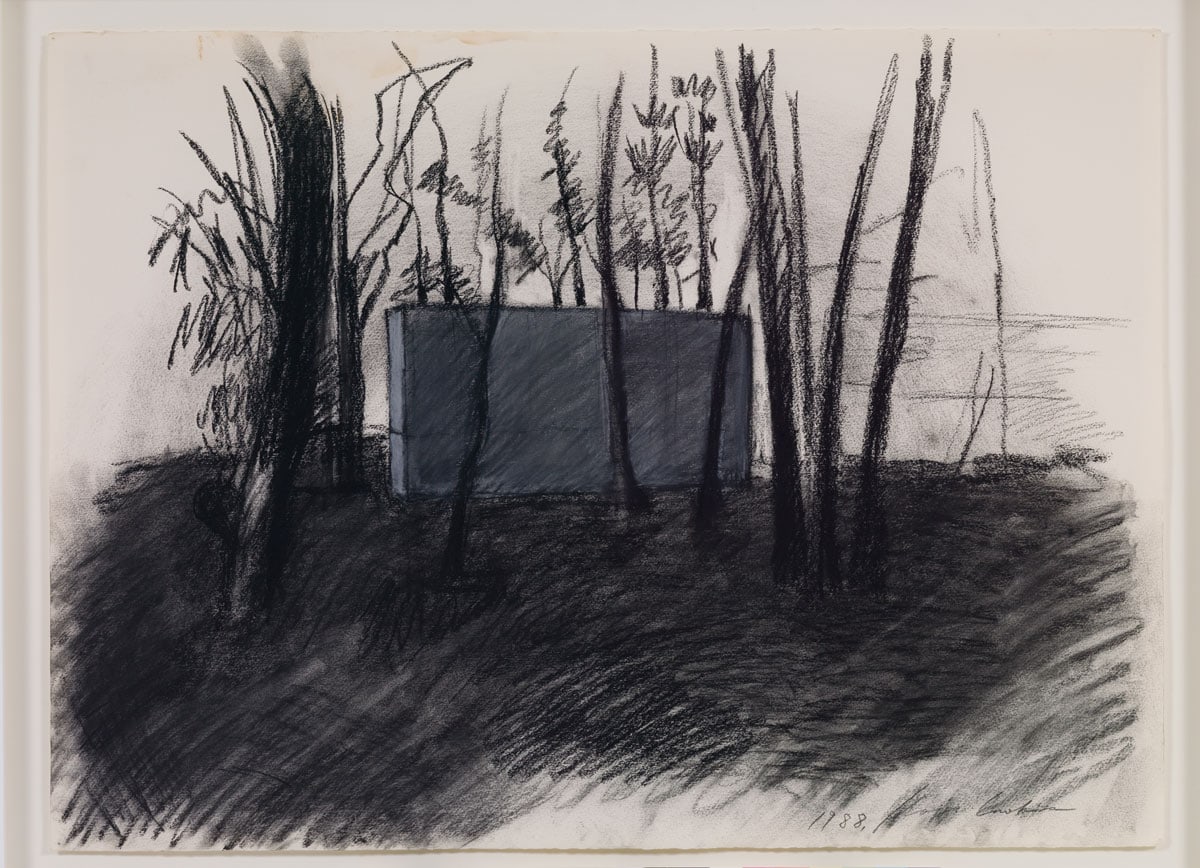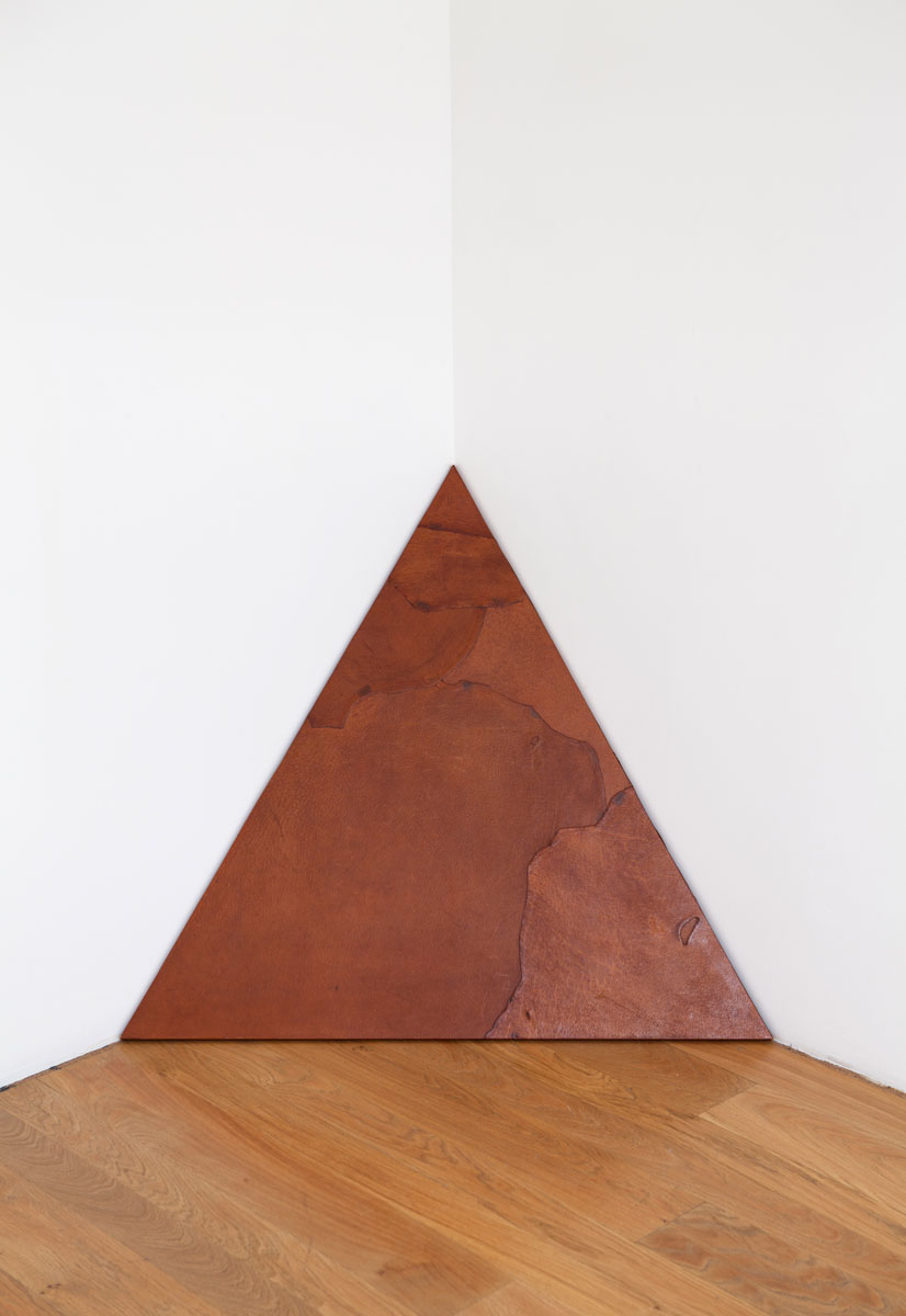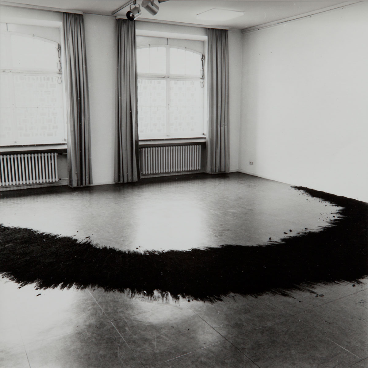 At the end of the 1960s, Kōji Enokura became associated with a loose group of artists who collectively came to be known as Mono-ha (“school of things”). Their ephemeral, site- specific work explored natural and industrial materials, examining their respective material qualities and the interdependent relationships generated by specific placements within a space. Enokura created one of his most iconic installations at the Paris Youth Biennale: Wall (1971), a three-meter-tall and five-meter-wide concrete partition between two trees in the Parc Floral de Paris. Throughout the first half of the 1970s, Enokura stained paper, cloth, felt, and leather with oil and grease. He also discolored the floors and walls of galleries and outdoor spaces. Though no longer extant, these installations are documented in photographs. During the 1980s and 1990s, Enokura continued to explore the act of staining on cotton fabric. In these works, the artist variously contrasts smooth fields of black paint with unpainted fabric, drenches the entire surface, or uses oil-soaked beams of lumber to mark the fabric—either affixing the beams to the work or leaning them against it. Enokura is also known for his signature fabrics hung diagonally on the wall and folding out onto the floor.