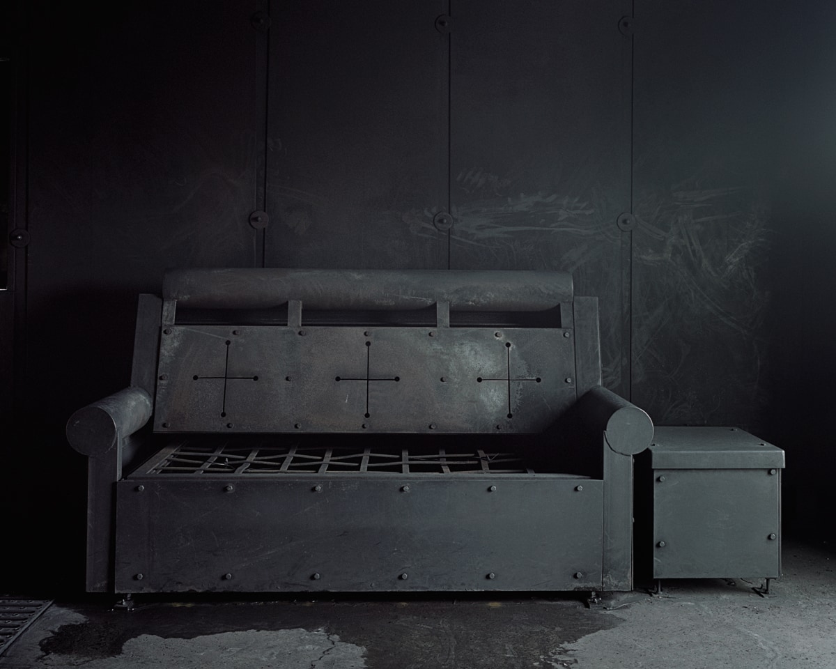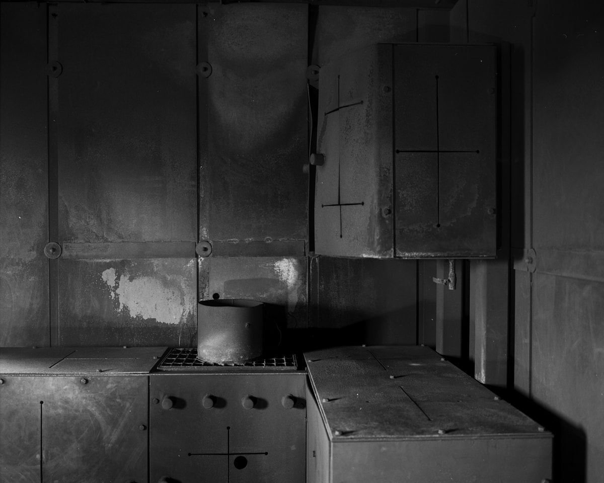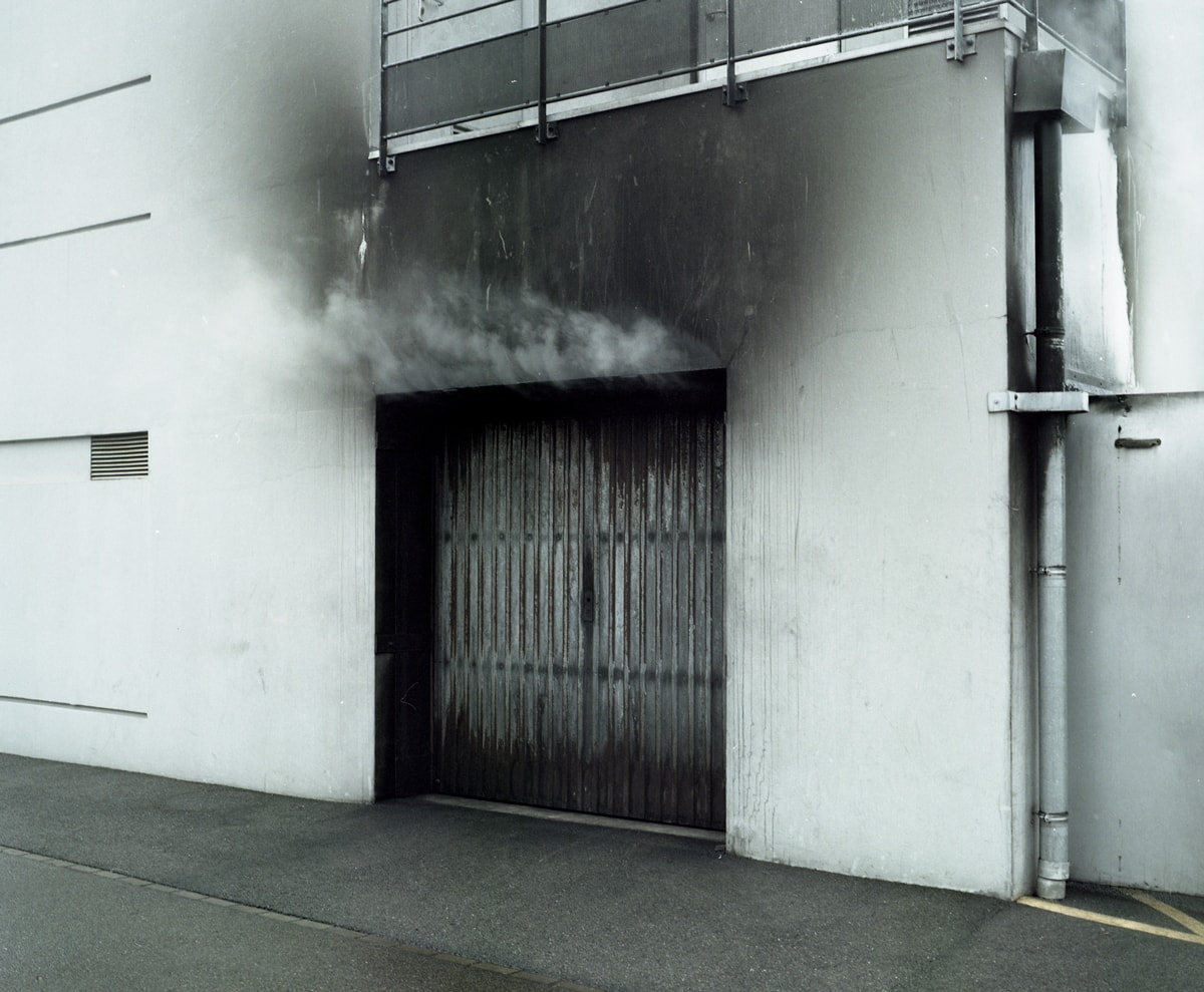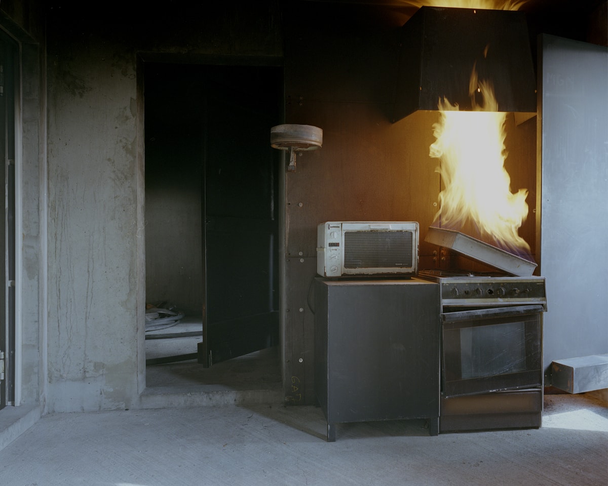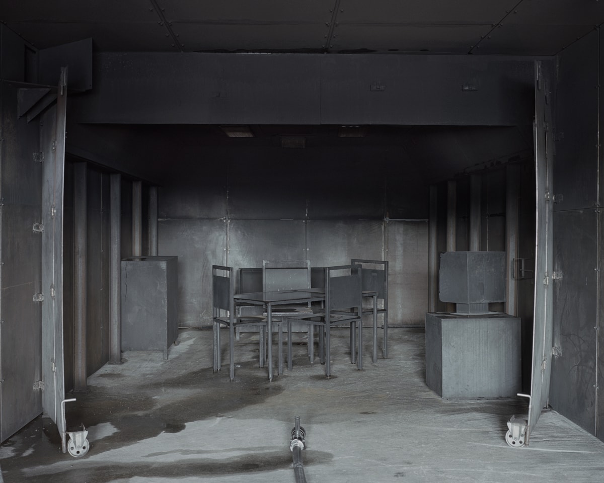Rooms, like a kitchen, living room and a home office blackened by soot appear to be black and white photographs contrasting with a bright red-orange burning bed. Seemingly well-defined pictures, that are neither real nor staged. We see neither living spaces nor furniture – what we see are learnt proportions, attached to hights, depths and design – an illusion of stainless steel and concrete of which grey values are no result of develop processes of photo material but of the prevailing soot. Other realistic arranged spaces guide our gaze from the furniture to yellow eye-catchers that make any functional meaning of the enviroment disappear and direct our concentration onto little details instead.