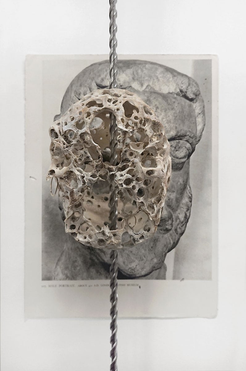 The idea of the object as an archaeological evidence that appears in certain compositions doesn’t reference to its passivity, and rather functions as a kind of assemblage that has to do with the incorporation of words, images, shapes and found objects to signify the distinctive attributes of those objects as an intrinsic element of a disembodied humanity. Through his eyes, matter often presents itself as a complex archaeological site characterized by a range of inanimate materials, life forms, technological artefacts, times in collapse and linguistic references. These structures combine fiction, life and inertness while triggering a space of transaction between the human linguistic way of apprehension and other forms of activating perception. Both human and non-human negotiate a dynamic entanglement with each other. Similarly Lamas’ oeuvre defies stability. Yet, there are recurrent approaches in his practice such as an interest for industrial products, the traces of humanity on nature or the body/technology entanglement; he also puts forward an aesthetic relationship between his work and rituals that invoke ephemeral images created by impulsive composition and interdependent making.