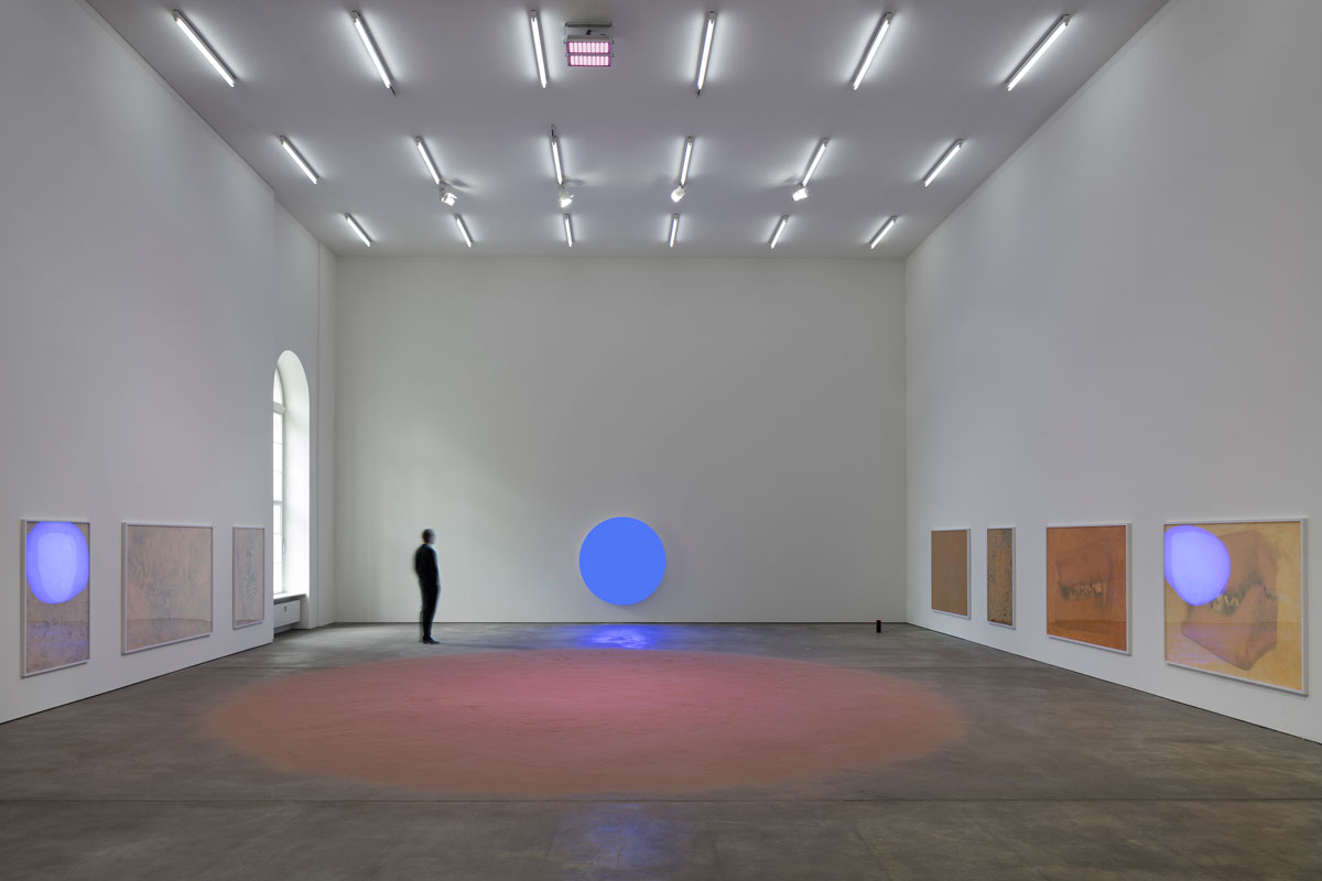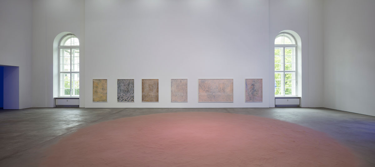 The site-specific installation Blue Runs at Art Basel Unlimited (2016), furthered Rosenkranz’s ongoing experiments with liquid forms: consisting of a continuously recycled blue stream of water flowing through the faucet of a common sink. The colour blue has been a recurring element throughout her practice. Its perception as a colour within the visible spectrum of the human eye evolved at a stage when creatures existed exclusively underwater. It was only after life started to thrive on land that the eye become sensitive to the full spectrum it can see today. Nevertheless, sensitivity to the colour blue has barely changed throughout the biological evolution of humankind, and humans still remain more sensitive to the wavelengths of blue than to all the other colours in the visible spectrum. In Blue Runs, running water created an aural effect as it splashed against the sink. Tinted with an artificial blue, the stream enhanced the viewer’s sensitivity to the molecular materiality of water, colour, and air. For her 2017 project Slight Agitation 2/4 at the Fondazione Prada, Milan, Rosenkran developed a large scale installation that explores how physical and biological processes can affect art. A huge mountain of sand, infused with synthetic cat pheromones and flooded with green RGB light, dominates the Cisterna. The work investigates a neuroactive parasite that affects 30% of the world’s population and determines attraction, repulsion, and public movement.
