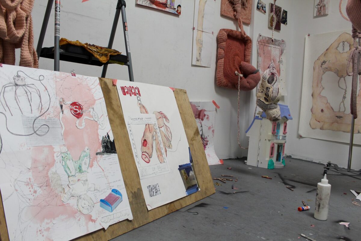 It collapsed the boundaries I had previously maintained between research and making. What started as reading to support my studio work eventually became a large component of the work itself. My writing, drawing and textile processes now function in dialogue, one holds the other in place, or undoes it. Psychoanalytic thought, in particular, has taught me to attend to gaps, repetitions, and transfers, both in theory and in artistic practice. I’ve become less focused on only producing finished objects and more invested in constructing objects which in turn have their own conversations amongst each other, amongst the reading, amongst the writing. This in turn results in through lines tieing them to larger conversations in the universe, in creating open-ended structures that can house contradiction, instability, and unresolvable questions.