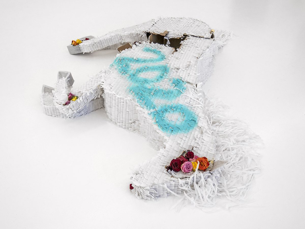 Polyurethane, faux fur, denim, studs, wood, metal, acrylic, mirror, rotating motor