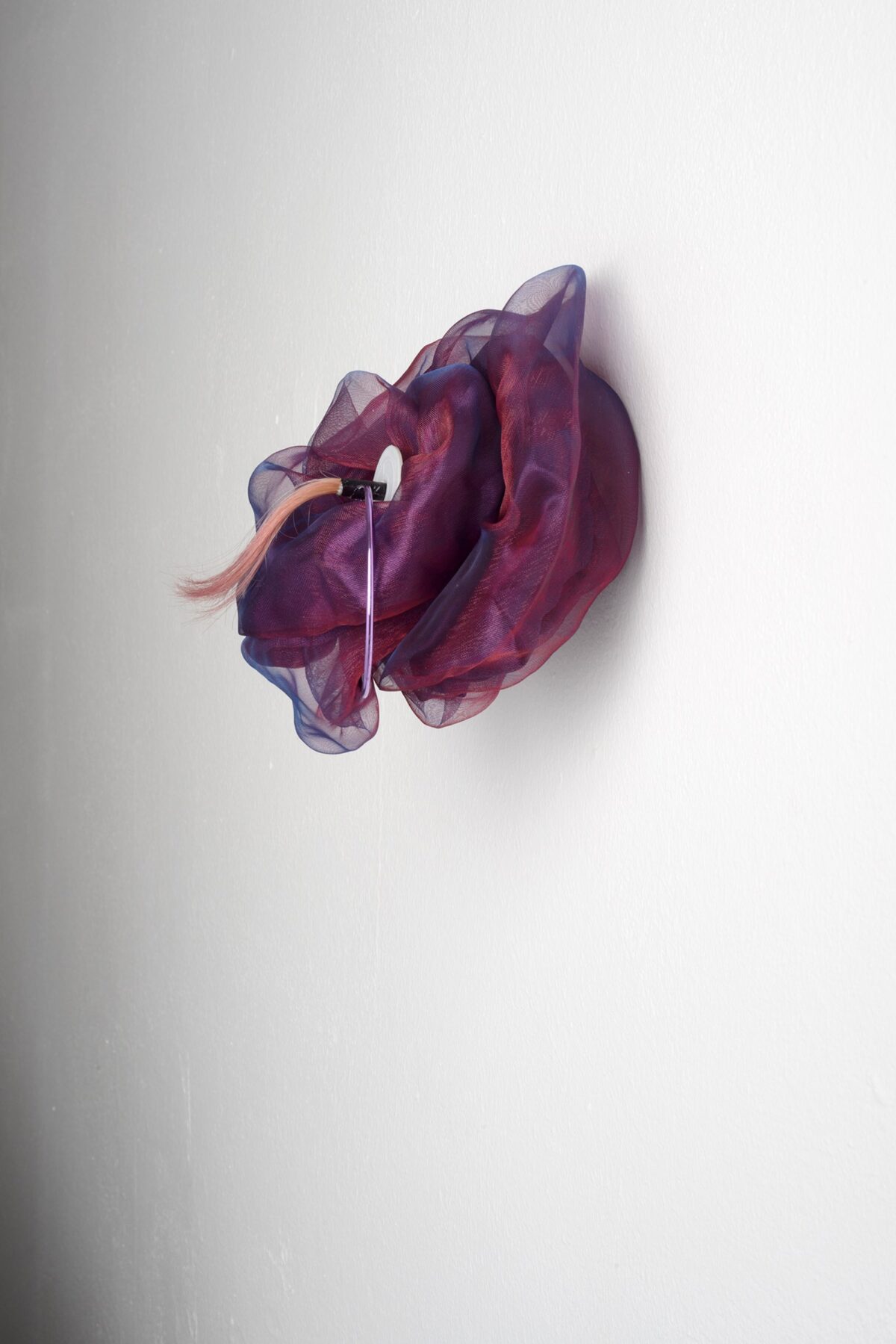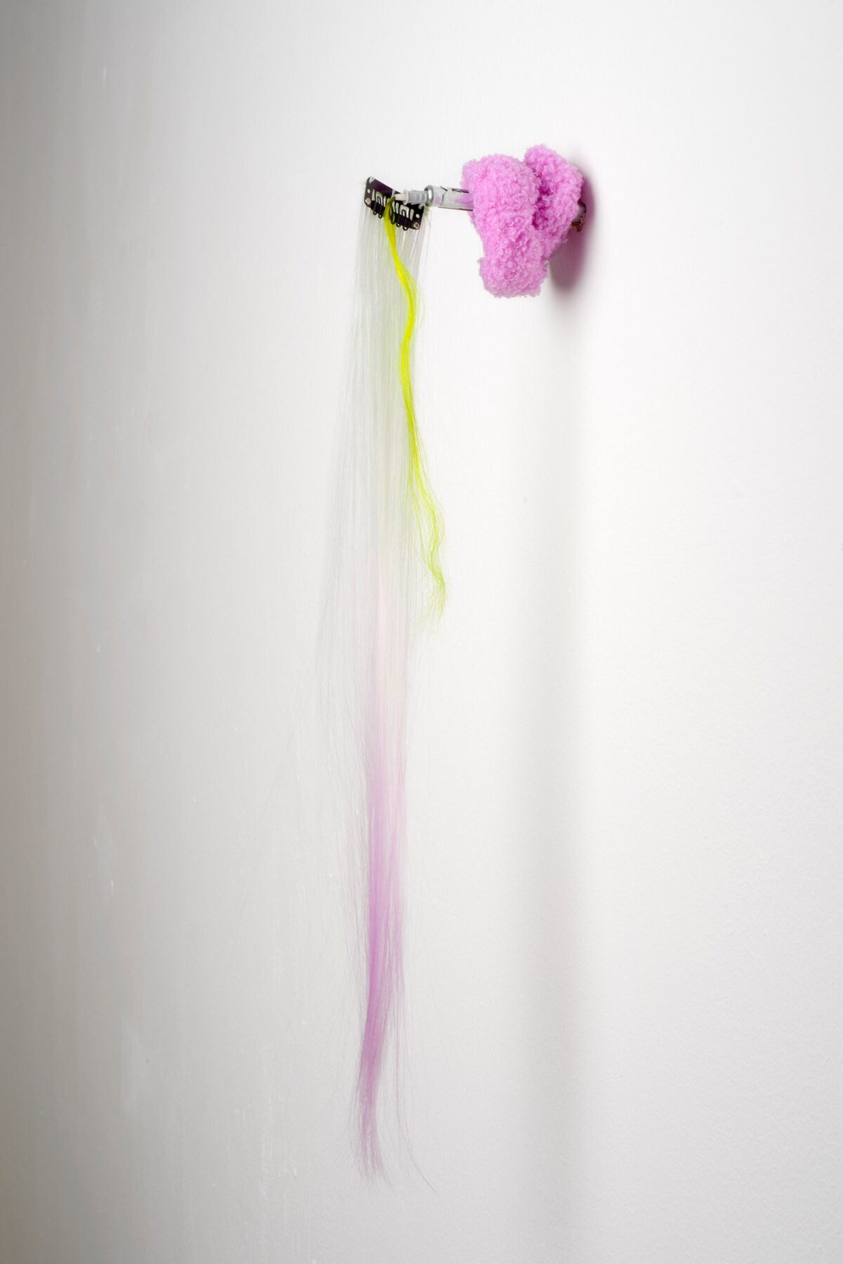 Grey nylon wall plug S5, metal frame anchor S10, white PVC tape, bleached straight hair dyed fluorescent green, synthetic green, white, purple coloured hair extension clip-in, purple synthetic scrunchie.