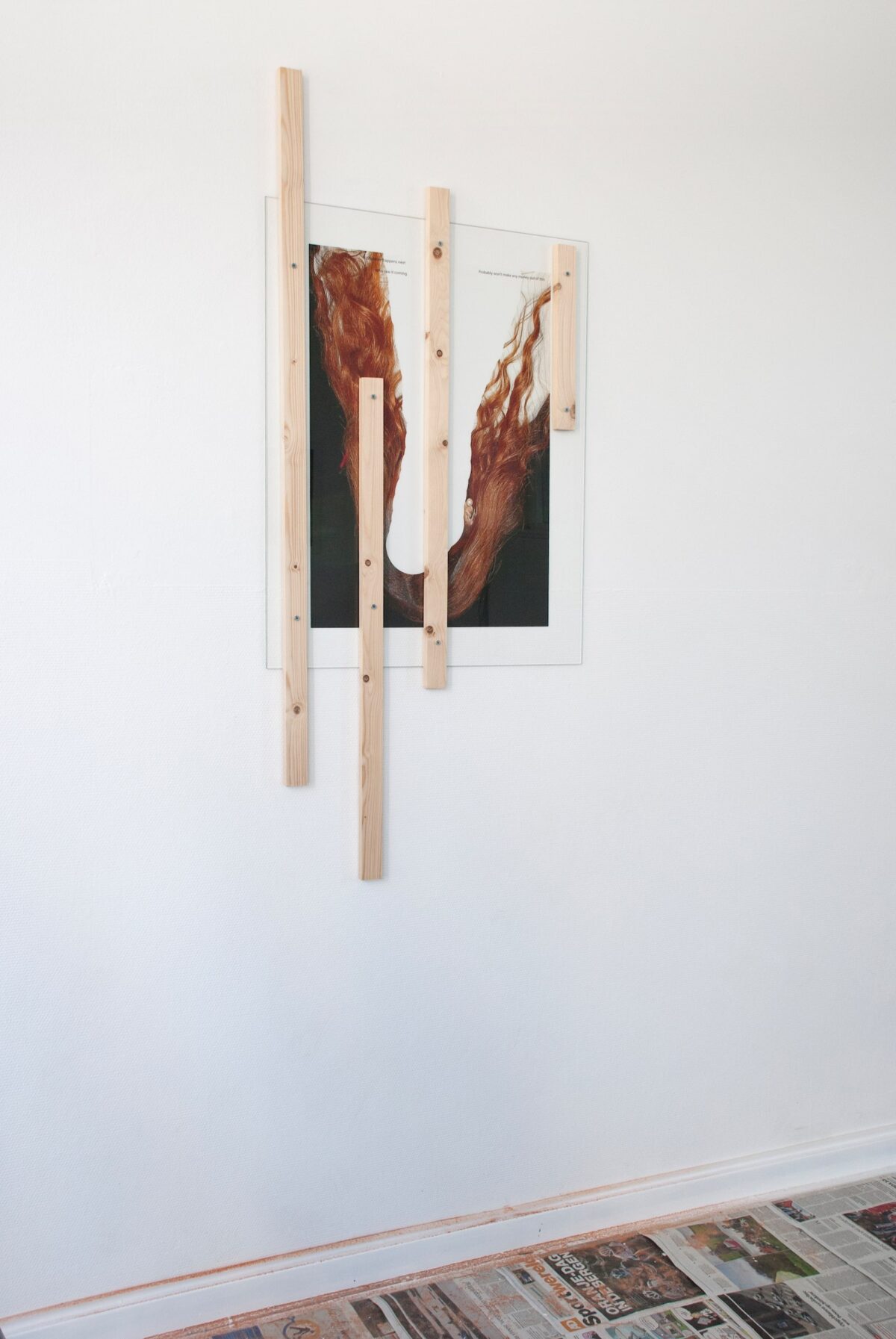 Glass, pinewood, inkjet print, screws