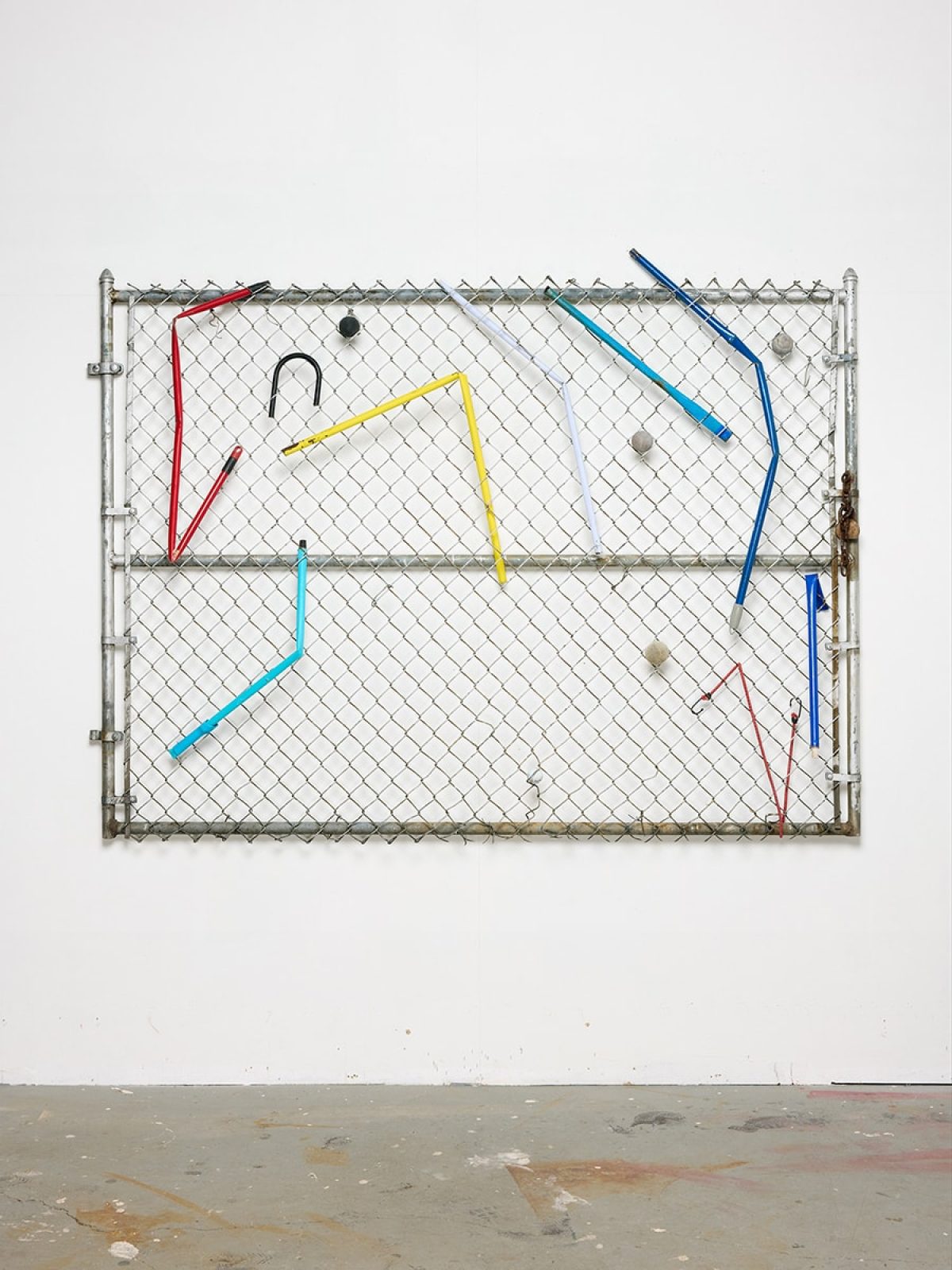 Found balls, broken broom & mop sticks, clipped bike lock, bungee cord in fence.