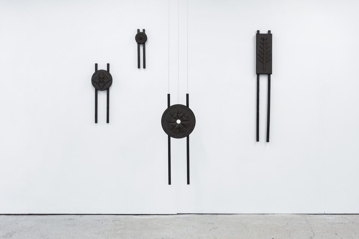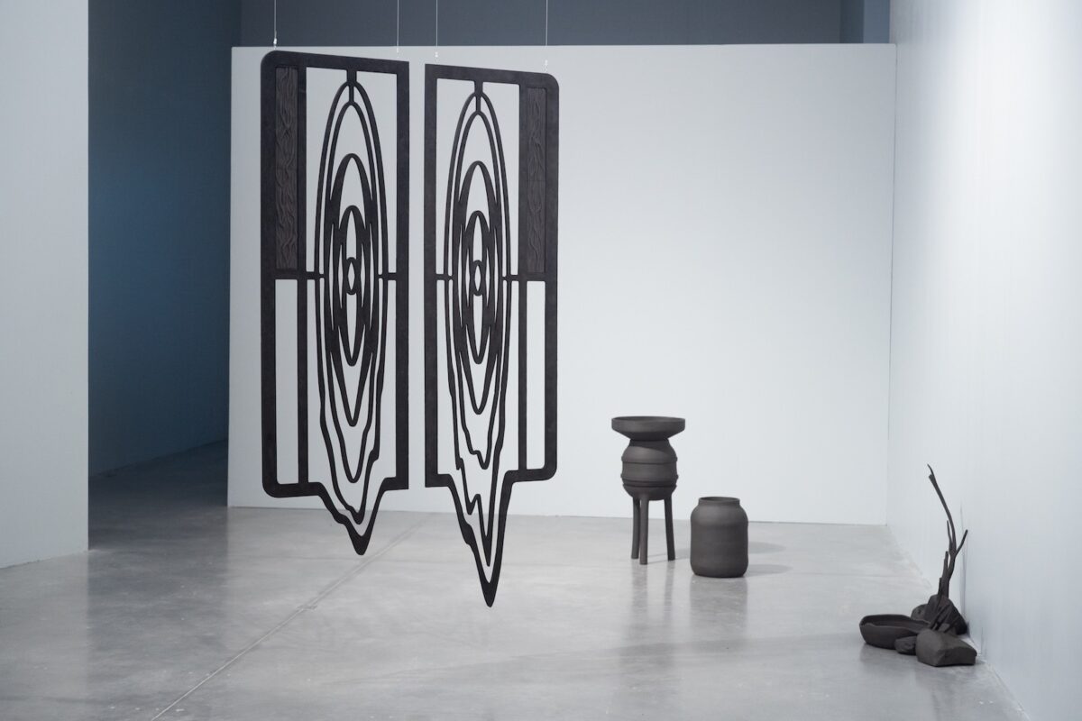 A recurring theme in my practice is the transformation of matter, both in a literal and symbolic sense. The materials I work with, calcined wood and ceramics, undergo alchemical-like processes, such as burning or firing, echoing notions of destruction, purification, and rebirth. This reflects a broader reflection on change: how do we move from one state of being to another? How do we navigate loss and transition in order to create new narratives? Alchemical nigredo, the idea that any transformation is only possible if we first go through a phase of stripping, accepting to lose something and mourning it in order to nourish a new cycle. The colour black in my installations also refers more broadly to the dark, the invisible, our inner worlds. In the same vein, my sculptures often take on hollow forms, like bodies filled with an invisible presence, or window shapes that also evoke this notion of the border between the psychic and physical worlds.