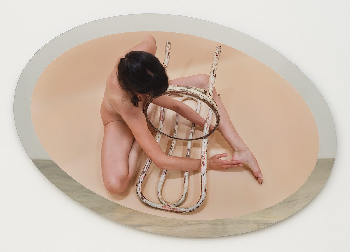 Untitled (Chair with mirrored seat oval), 2021, Pigment print mounted on mirrored plexiglass, 38 x 55 x 1in.