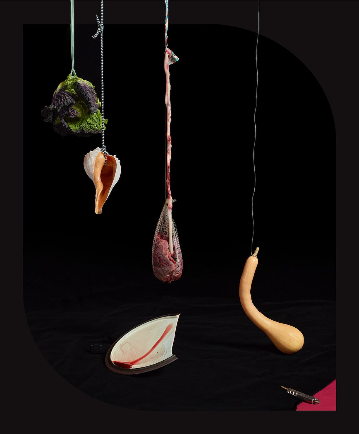 Hanging placenta with lettuce, shell and squash, 2023, pigment print, 50 x 40 inches