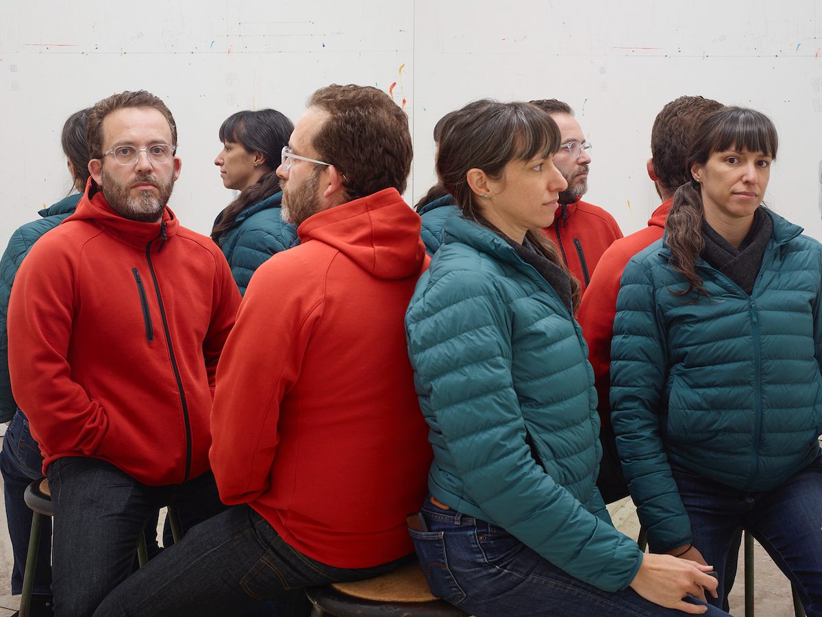 Recently my practice has begun including other people for the first time. In 2021 I created a ‘mirror room’ where I could make photo-multigraphs. Normally two mirrors are used to create 5 subjects from one sitter, but I wanted to make these reflections of my whole body. Throughout the process of working in this space, I began to invite family and friends into my studio, and over the last year I’ve made portraits of others as well as myself. Sometimes I’m hidden or completely out of the frame, but sometimes you can see me making an expression that the subject is reacting to, or we are even sitting together in this confrontative but intimate space.
