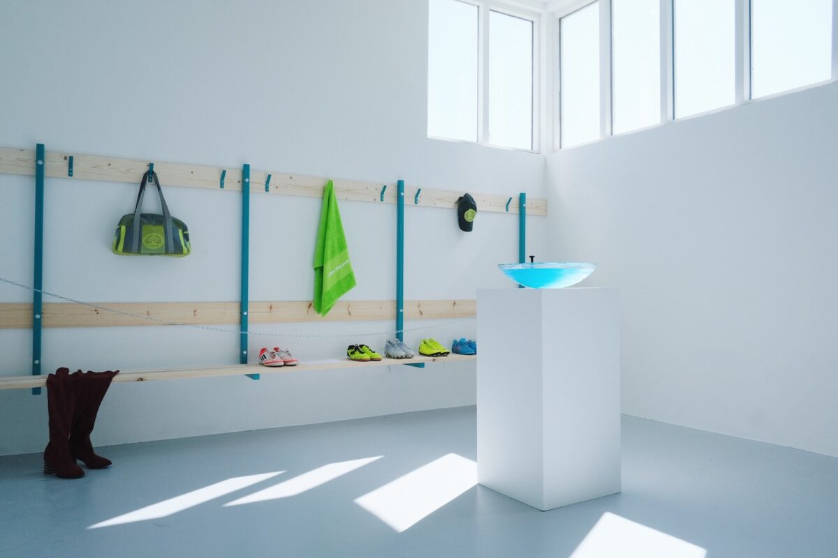 Installation: Machine knitted textiles, wood, metal, printed towels, pre-workout water fountain, football gear