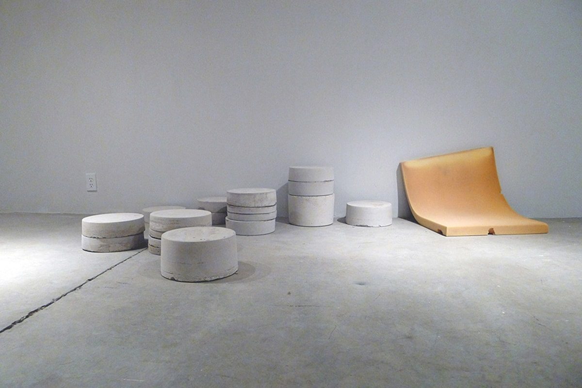 Cement Casts of Buckets and Remnant Sofa Cushion. Varied Dimensions.