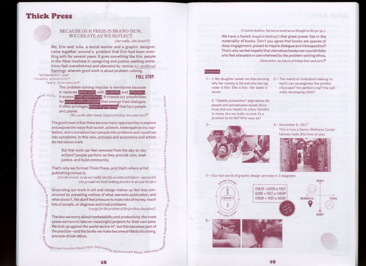 We are always trying to figure out how the content and design can live together. In some instances, the design follows the content (in our first publication, Erin interviewed elders and Julie then created a multi-vocal structure in the book). In other books, the design and content live simultaneously (here we are thinking of our original book, emerging series, where we created three different sized signatures as the form that the author could then activate). Sometimes the design comes before the content, like in our forthcoming Encyclopedia of Radical Helping where the form of the encyclopedia generates a community-driven list.