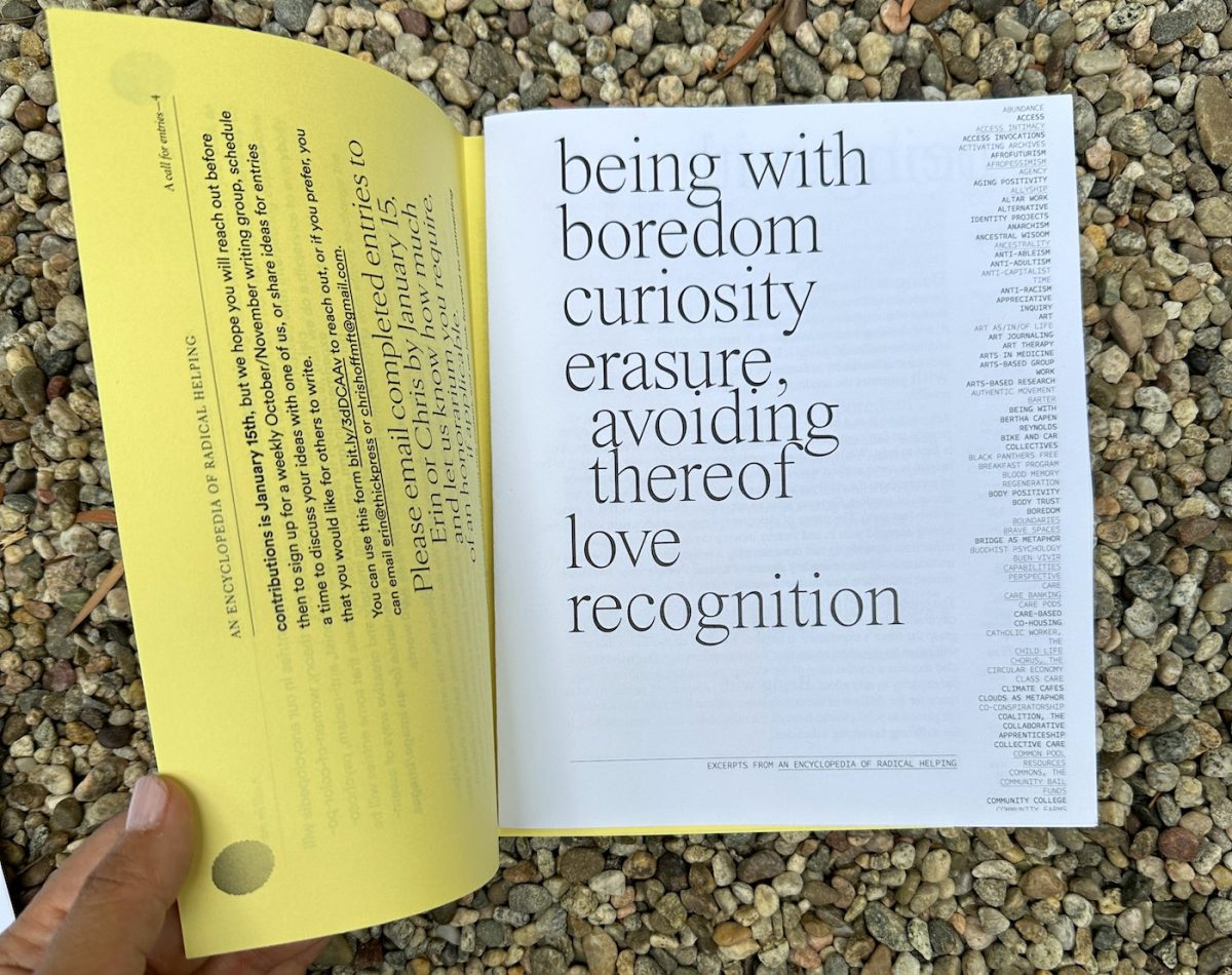 We find people we want to work with, and then we work together from beginning to end, making a book together. For our upcoming publication, An Encyclopedia of Radical Helping, we departed from that approach, putting out an open call and receiving over 200 encyclopedia entries. We didn’t reject any work or require any revisions, although we did engage in dialogue with contributors about how to make pieces the best versions of themselves. We’ve been working on cross-references between entries, creating a volume where the whole is greater than the sum of the parts.