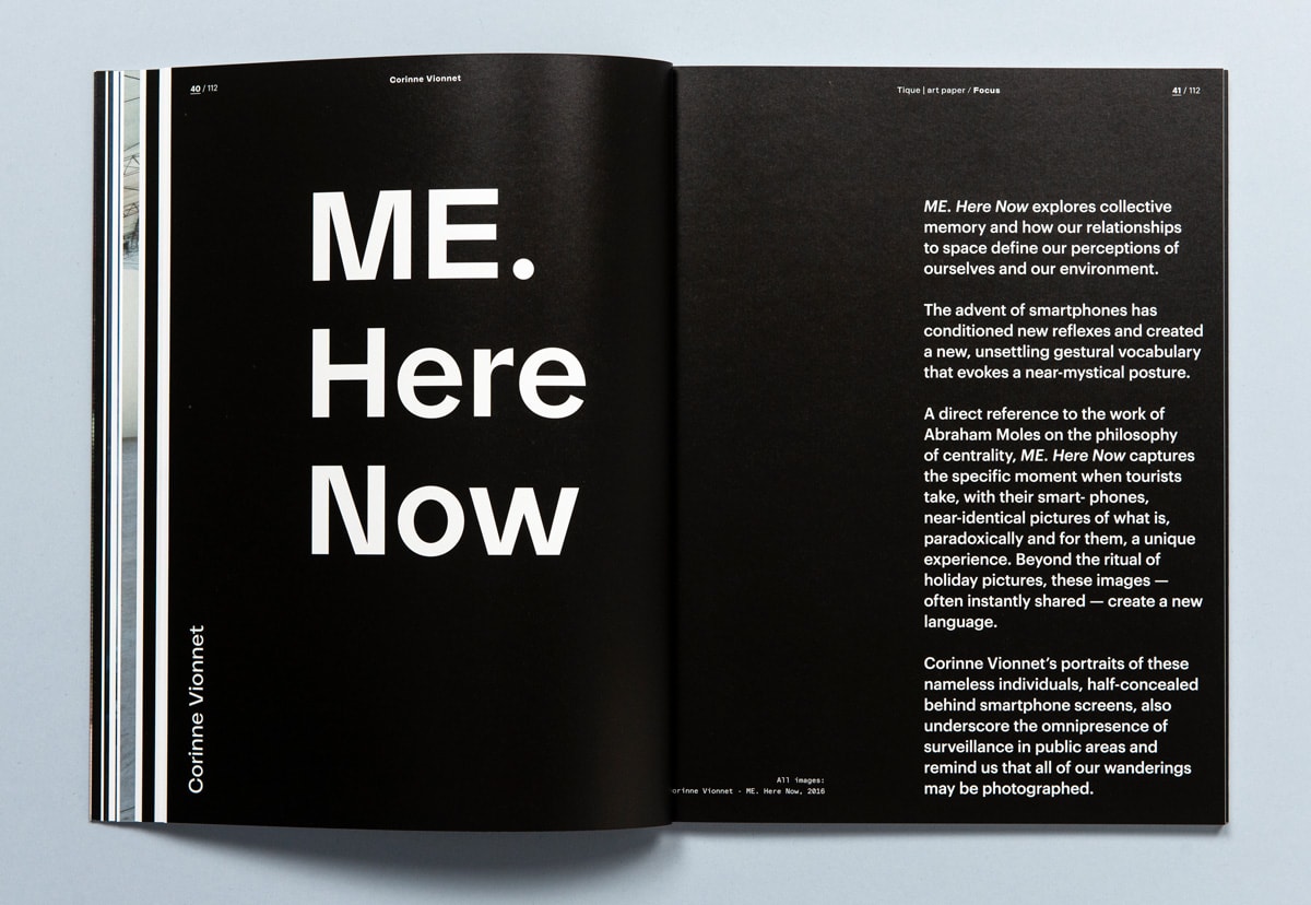 This issue is divided into three sections: Information, Focus and Inspiration. These sections are interspersed with Tique Artist Editions, works made specially for the magazine. These works are also available as signed limited editions.