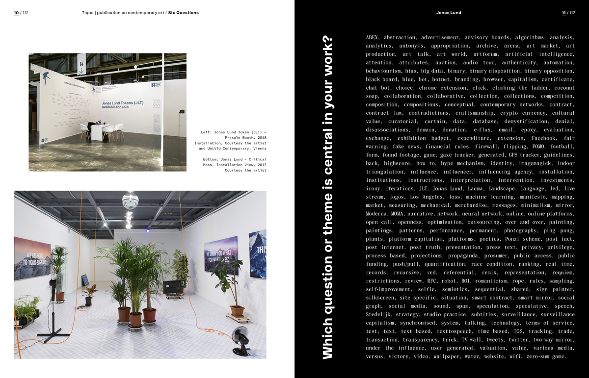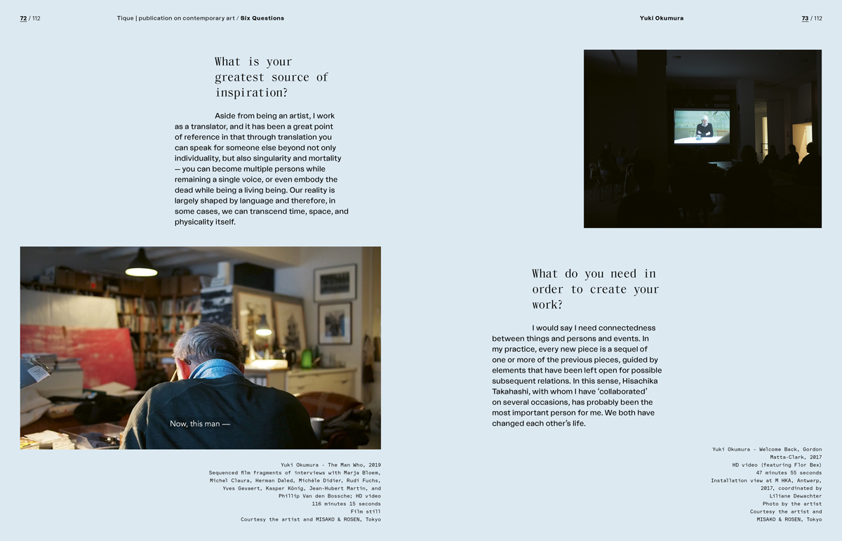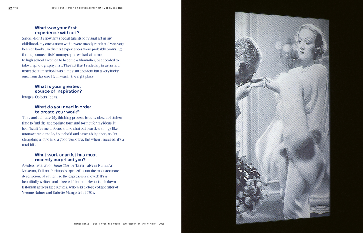 Tique #3 Six Questions contains interviews with Jonas Lund, Marge Monko, Letha Wilson, Félicia Atkinson, Ali Zanjani, Paulien Oltheten, Marc Nagtzaam, Yuki Okumura, Katja Mater, Eric Giraudet de Boudemange, Paul Kooiker and Lito Kattou.