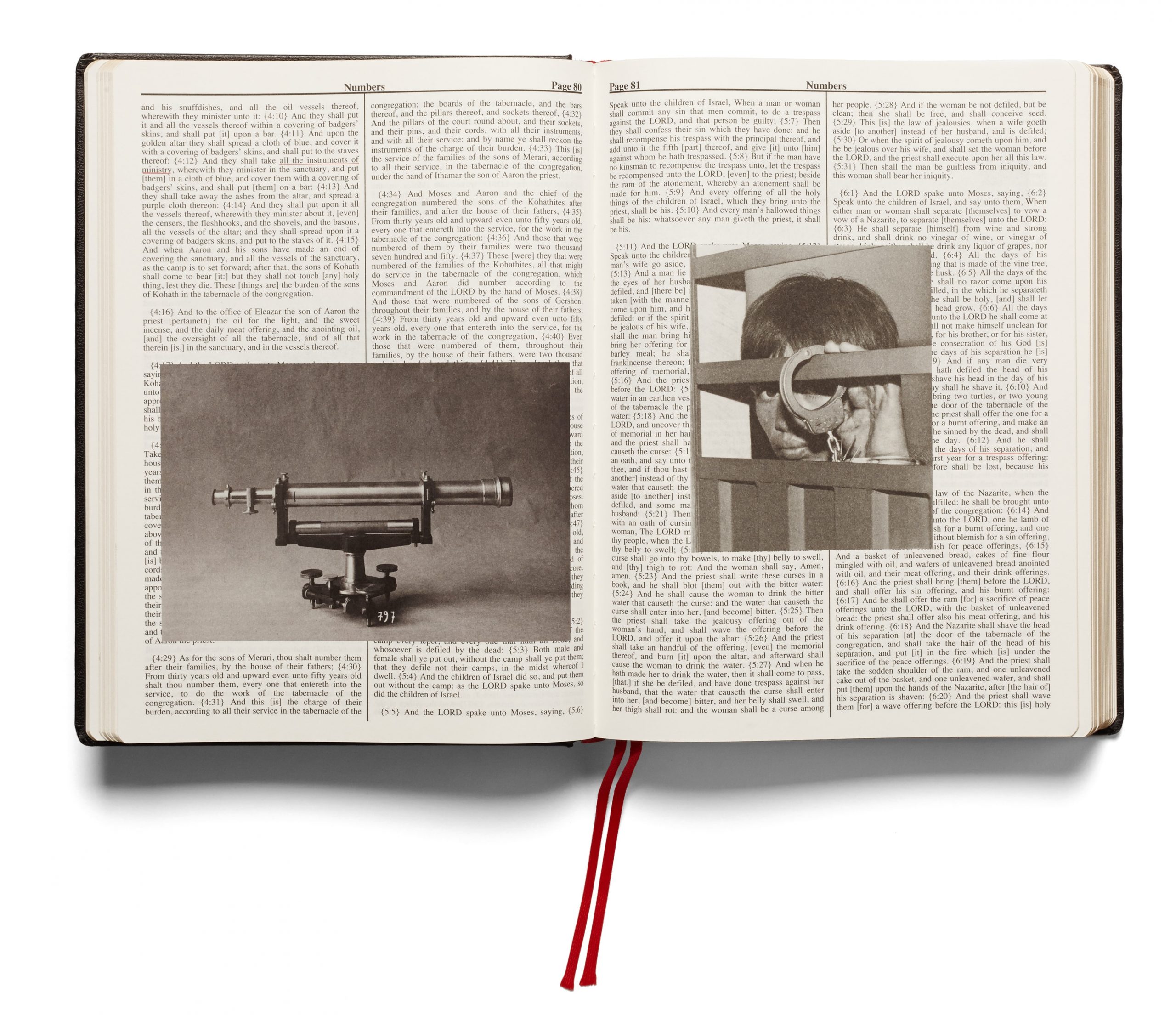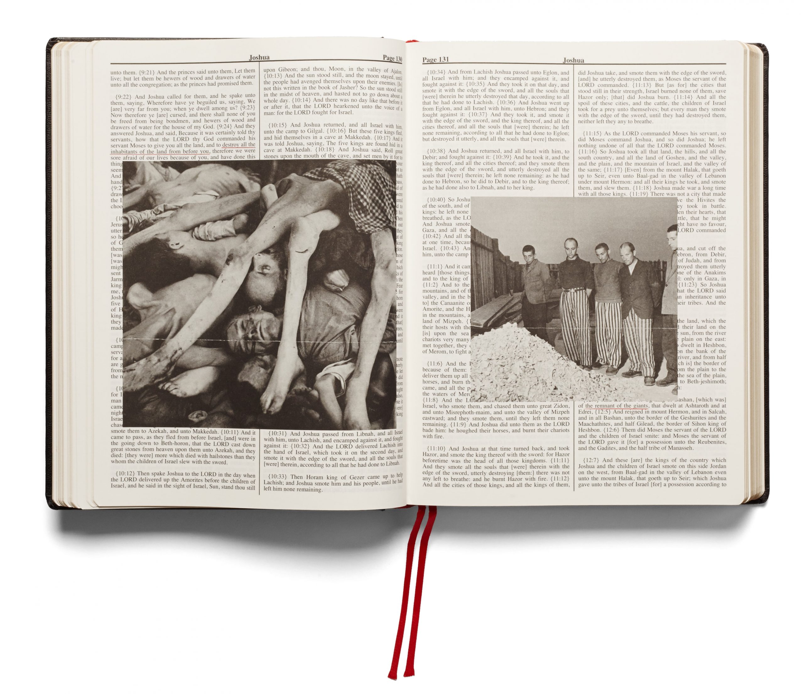 The format of Broomberg and Chanarin’s illustrated Holy Bible mimics both the precise structure and the physical form of the King James Version. By allowing elements of the original text to guide their image selection, the artists explore themes of authorship, and the unspoken criteria used to determine acceptable evidence of conflict. Inspired in part by the annotations and images Bertolt Brecht added to his own personal bible, Broomberg and Chanarin’s publication questions the clichés at play within the visual representation of conflict.