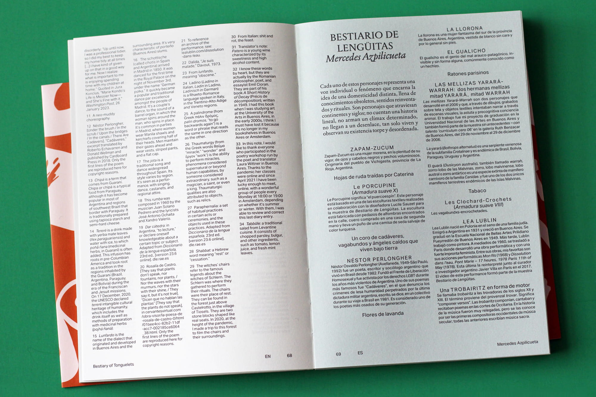 It began in dialogue with curator Virginie Bobin in Paris in 2017 and follows the thread of a script written for a performance that has yet to take place. Using local, obsolete knowledge systems, “neobarroso” poems, failed translations, and ambiguous ingredients, Bestiario de Lengüitas stages a choir of grotesque characters who try to maintain chaos and excess in a world calling for order, efficiency, and transparency. Azpilicueta pays a tribute to “proto-scientific” knowledge primarily disseminated among women—such as midwives and witches—before religion, capitalism, and modern medicine silenced them. The uncanny contaminations that occur between plants and bodies were fed by several encounters in the streets of Paris, the Botanical garden of Madrid, and the magical forests of Bolzano—thus generating a new embodied cartography of knowledge that transpires through scripts, drawings, and artworks by mobilizing storytelling, fables, and the reactivation of ancient rituals.
