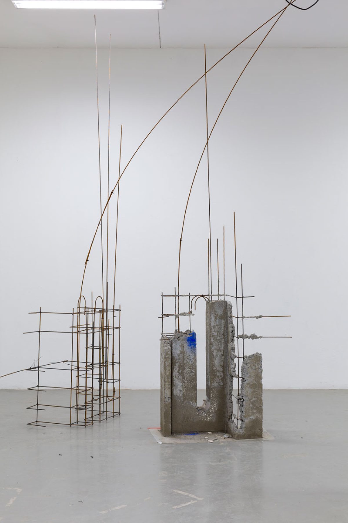 Concrete, plastic, clay, mdf, reinforcing steel, pigment, tie wraps each object
