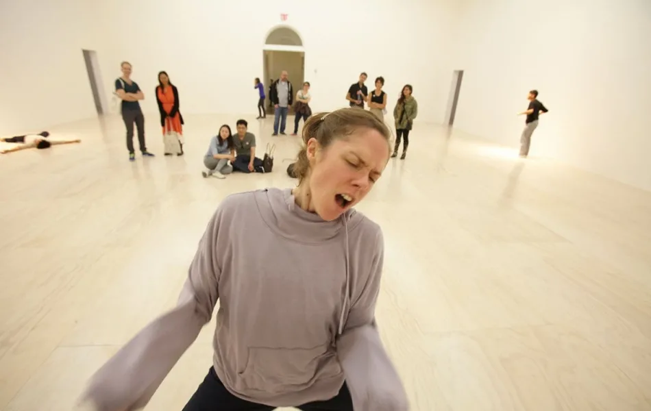 A visitor in an exhibition can walk in the space while in the theater a spectator seats on a chair.