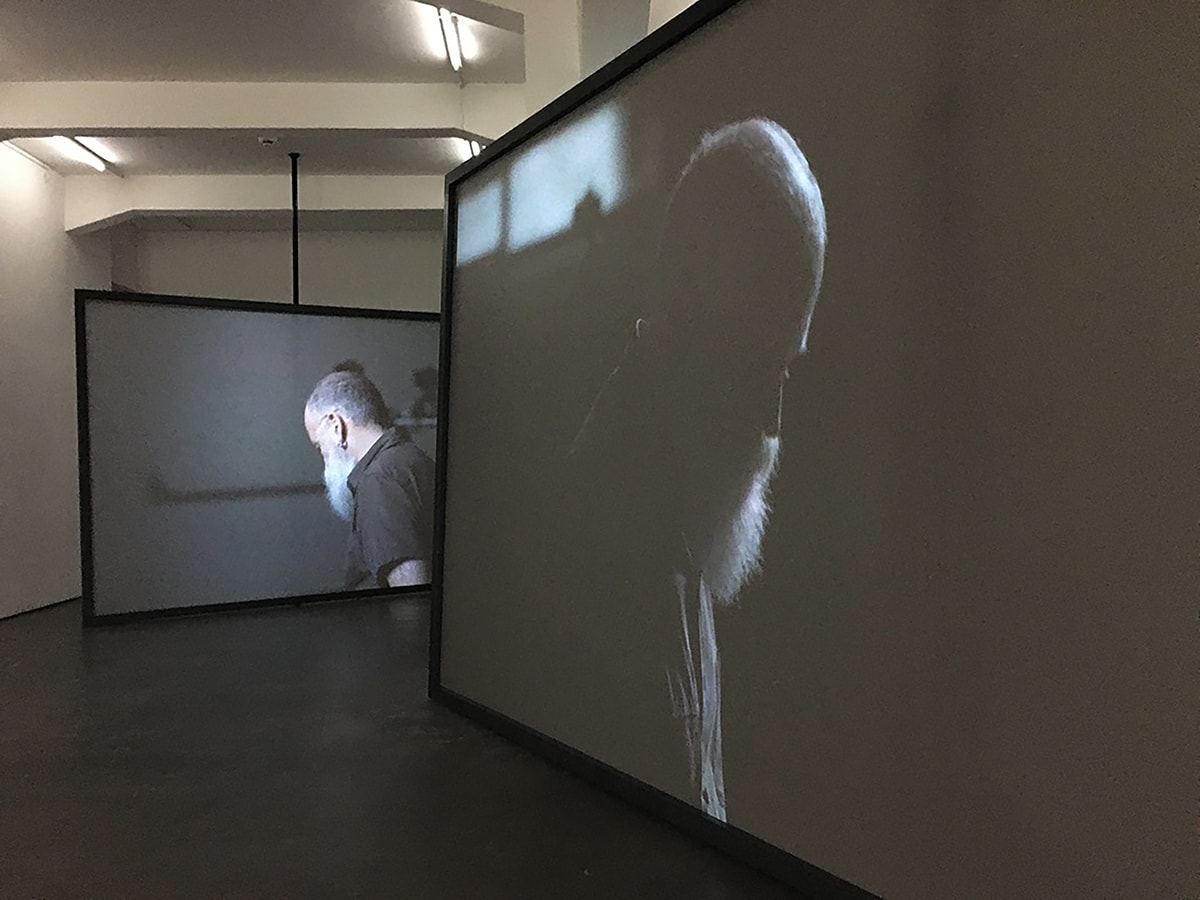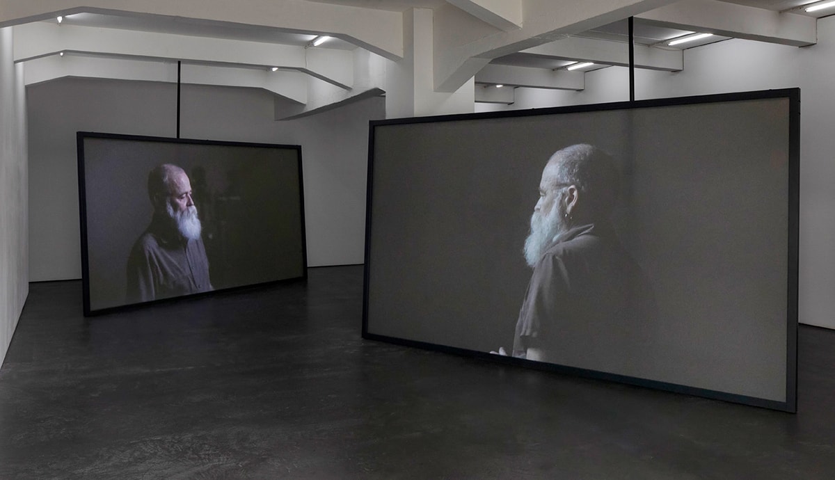 The Portrait #4 is about the Canadian artist and curator AA Bronson, who enjoys cult status as cofounder of the artist collective General Idea. Bronson stands alone in an undefined space. Two cameras revolve around him. When one of them captures him from the front, the other is at his back. Like planets, they orbit Bronson at their center. One occasionally hears footsteps and the whirring of the cameras. The two sequences are projected onto two monumental screens positioned at angles in the exhibition space. The cameras’ different perspectives are understood in relation to each other; they converge and interlock. The central staging of a single figure without narration or scenic embedding is reminiscent of Andy Warhol’s Screen Tests. Welz consciously follows this tradition, while developing his own aesthetic and methodical approach. Unlike Warhol’s actors, however, AA Bronson is not limited to looking at the lone camera. Bronson stands calmly, as if in the eye of a hurricane, undeterred by the ceaseless, circular movements of the recording devices.