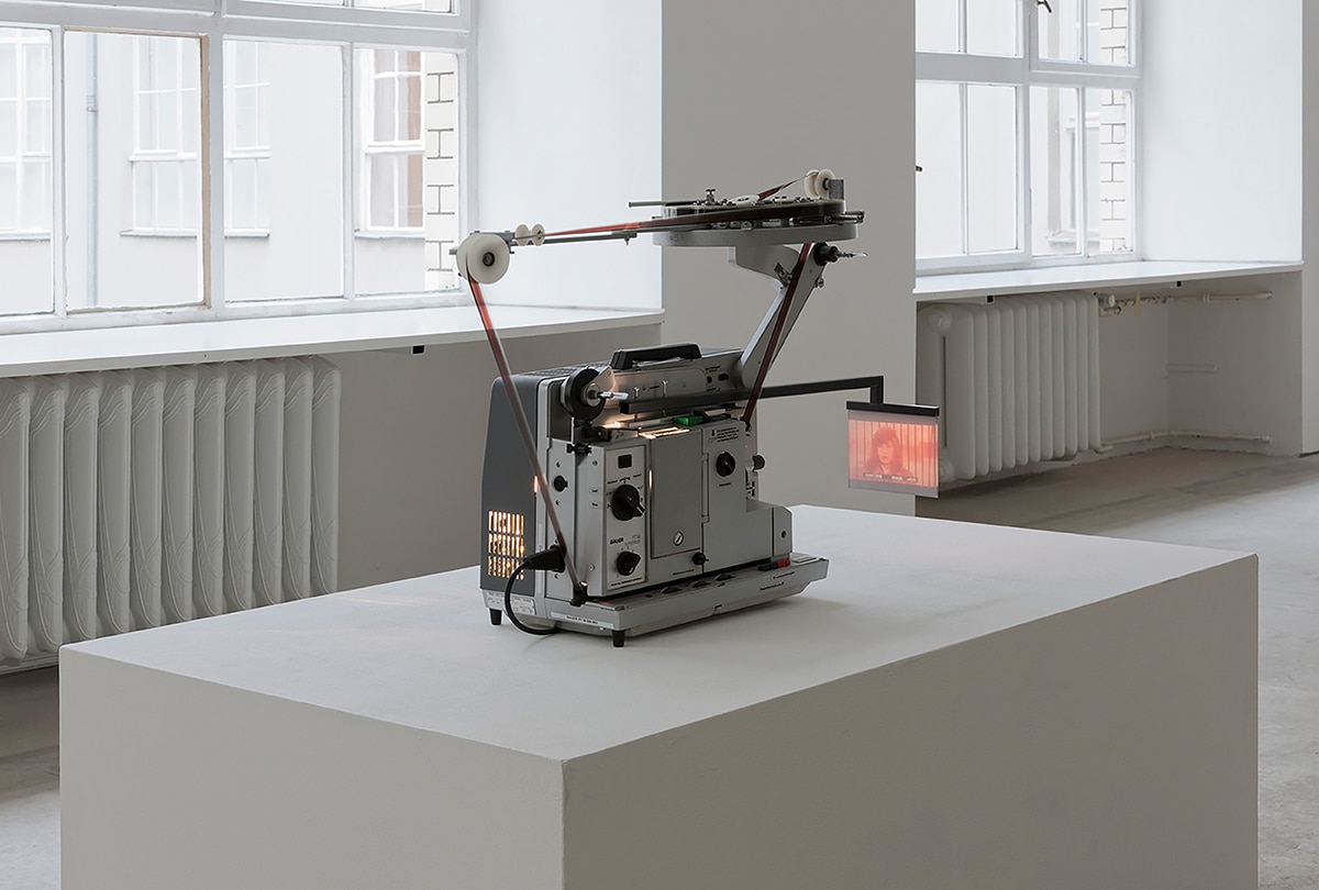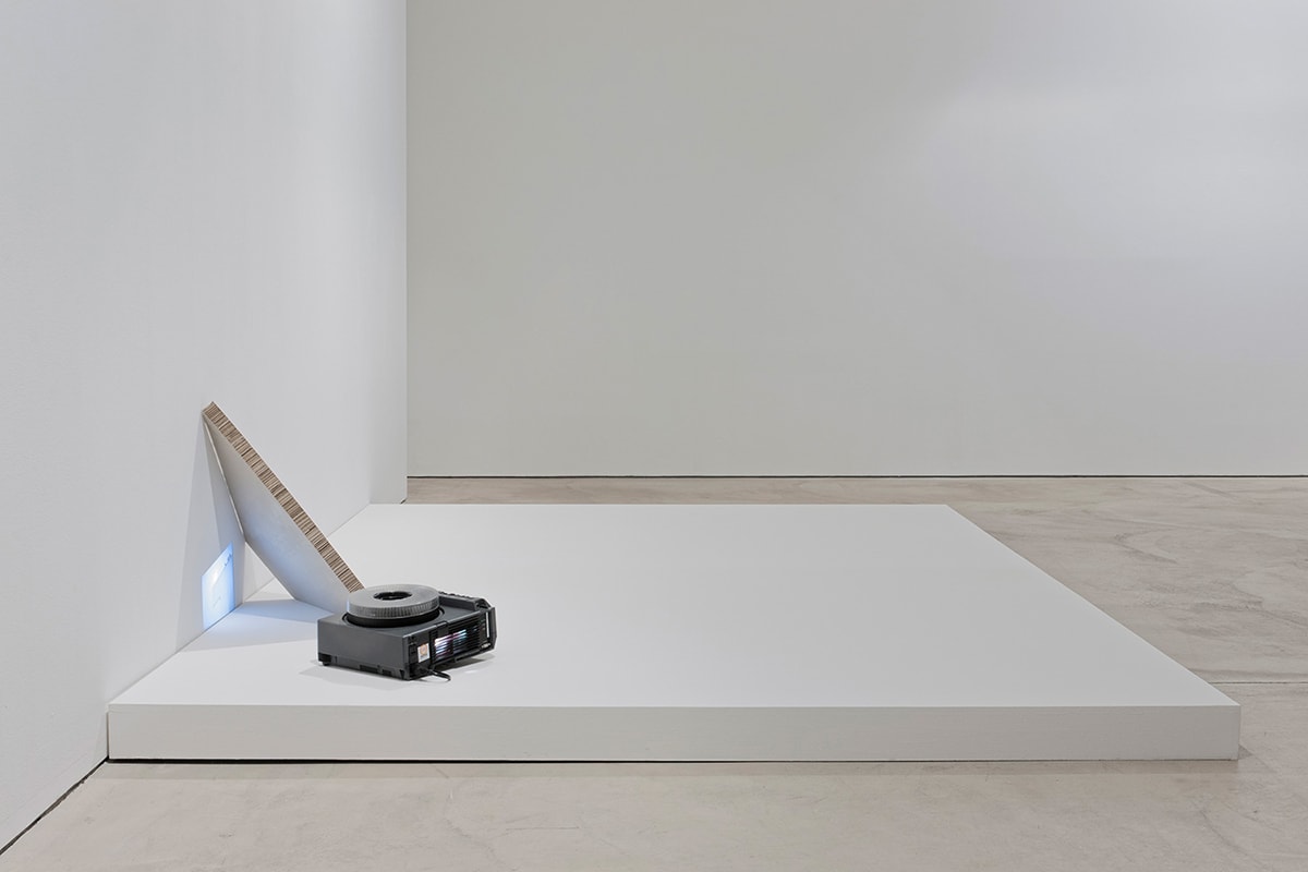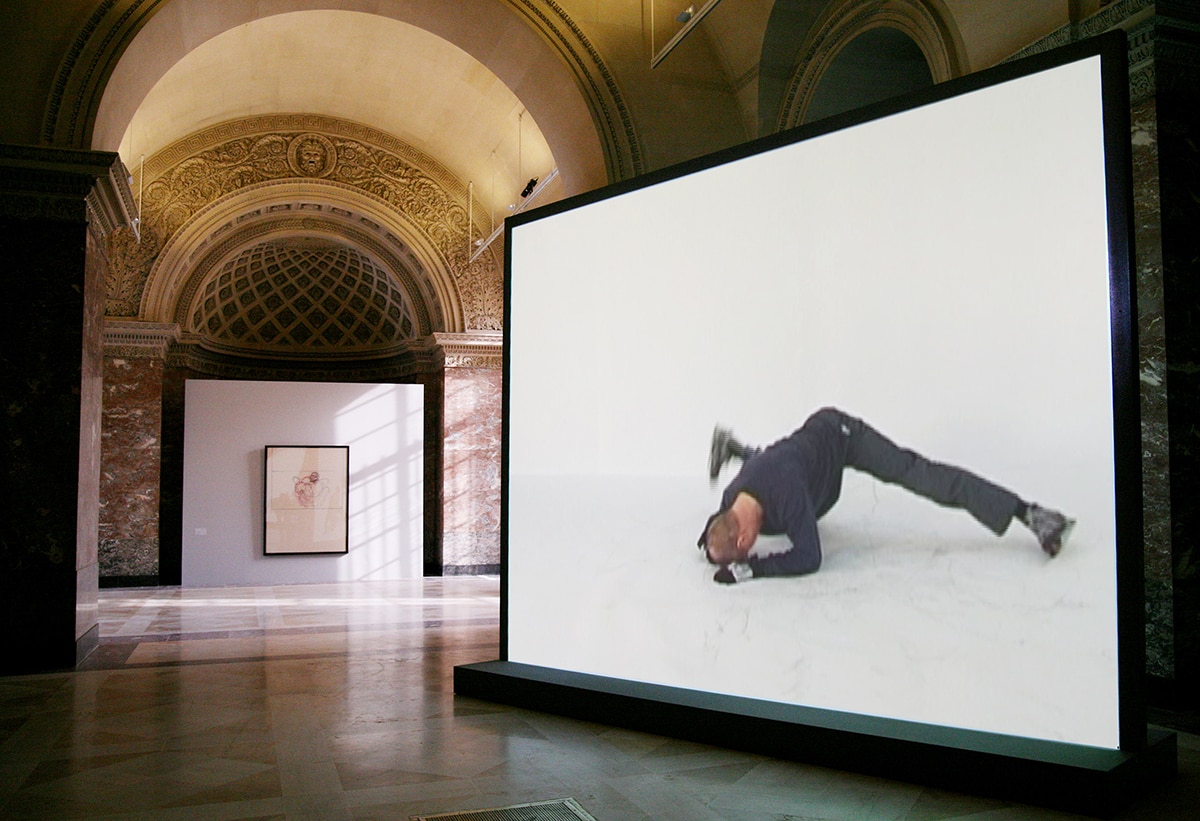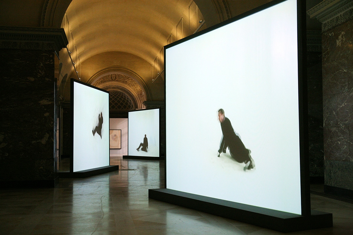 In contrast to the usual presenta1on of films, in dark projection rooms or on large screens, he treats video screens, projectors, and monitors like sculptures by placing them in the middle of the room. Viewers move between the projection surfaces on which the film is being played. At times they walk behind the picture; at times they stand in front of it. They view it from an oblique, menacingly foreshortened angle or head-on from the perspective of the original camera. They become part of the cinematic image itself. They steer their bodies and gazes not only through the space, but also through a sculpture and a moving image. The boundaries between work and viewer dissolve.