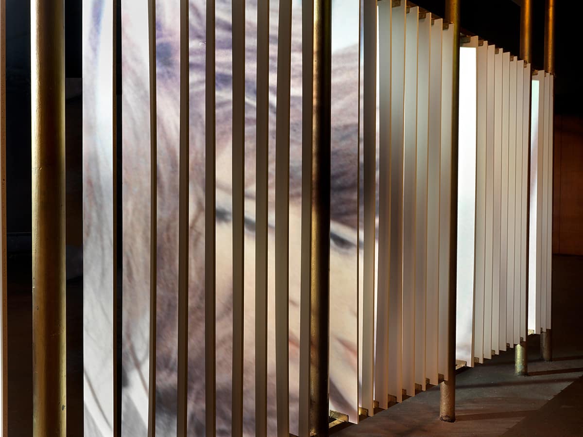 The slats and panels cut up the projected image depending on the posi1on of the viewer in space, so that the video projection is visible as a whole only at one particular viewpoint, otherwise split up and is rearranged anew by the given structure. The projected video sequence focuses on a very crucial moment of Red Desert, when Monica Vim is asked to cry. It is the most vulnerable, private and powerless moment, and the very point where the fictional reality overlaps with the actual reality. During the filming Michelangelo Antonioni corrects the scene by walking into the frame twice and finally neglects this sensible moment in the final version, as it would have altered the whole outcome.