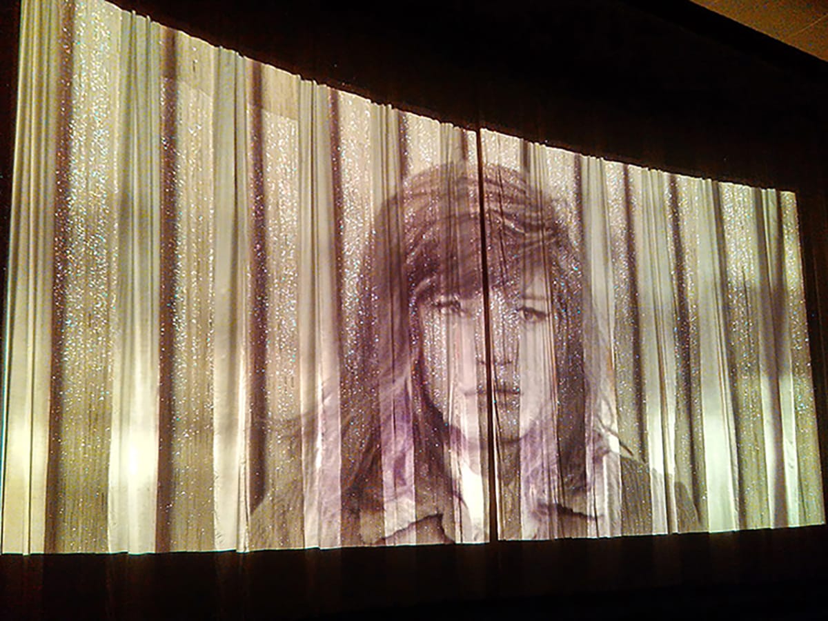 35 mm transferred onto HD, projec1on onto white & glitter cinema curtain,