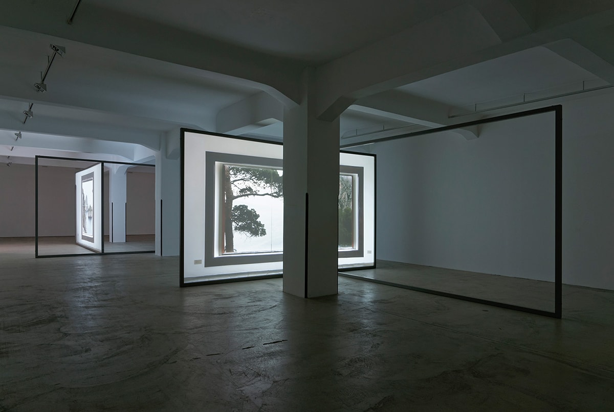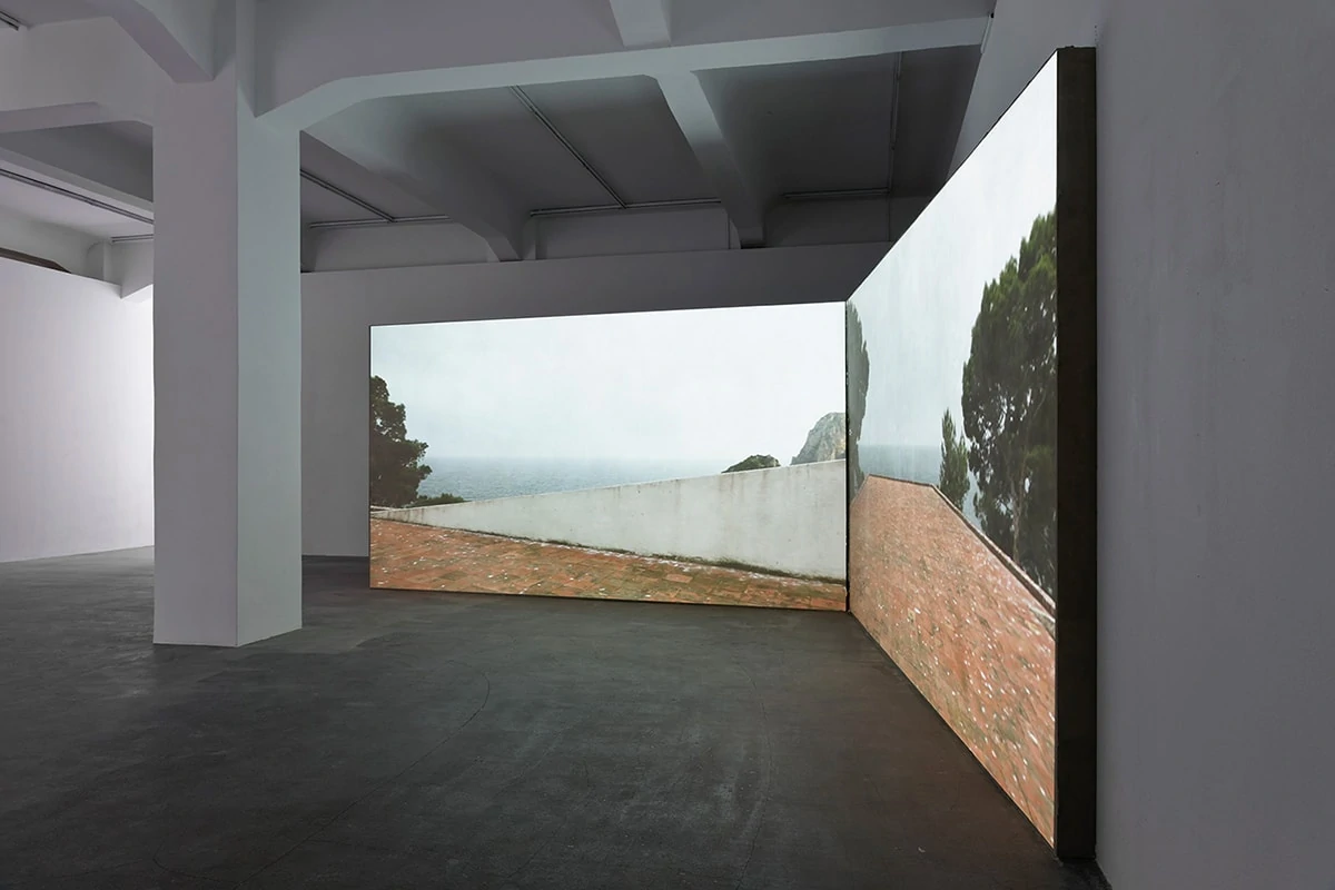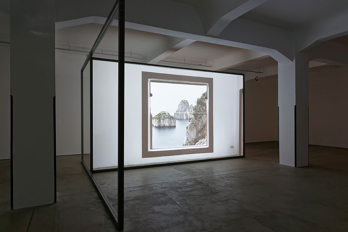 We are drawn into several sea views from the windows in casa malaparte [window 01], 2014, looking onto the surrounding rocks and islands. The video projections are installed on large aluminum frames that edge out into the gallery space. They create a strong physical presence that alludes to the modernist principles of Malaparte’s house. Yet we cannot see the interior of the rooms. Like Malaparte’s home, Welz’s installation provides calmness and seclusion against the splendor of the view on display.