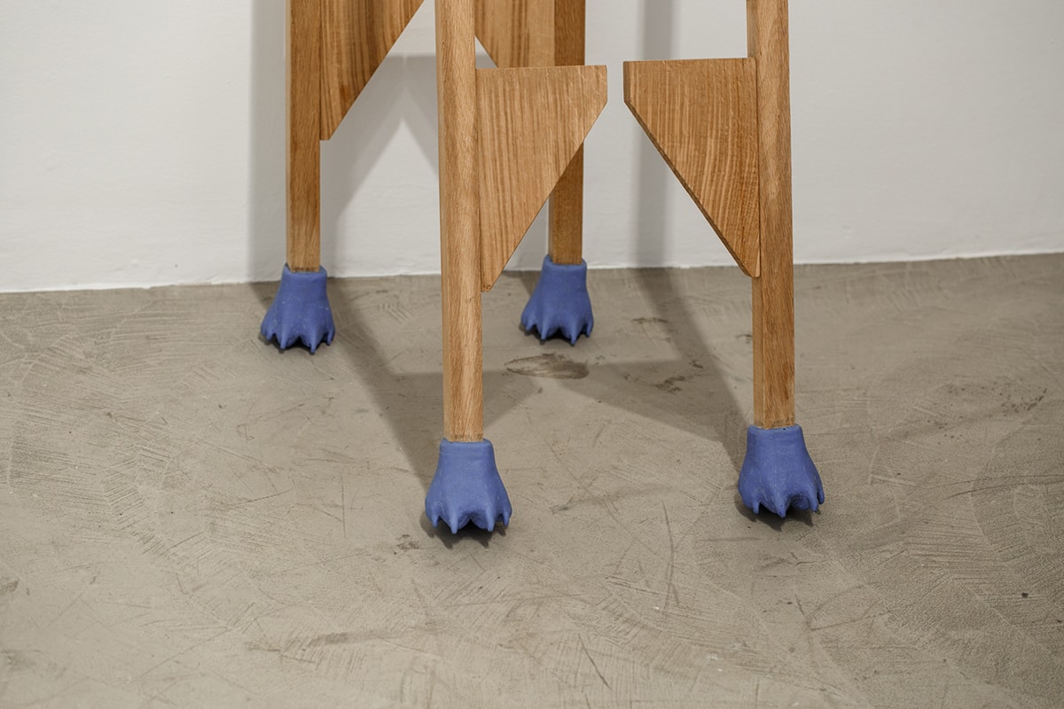 Four stilts made from oak wood and plastic cast of 2 pairs of wolf feet