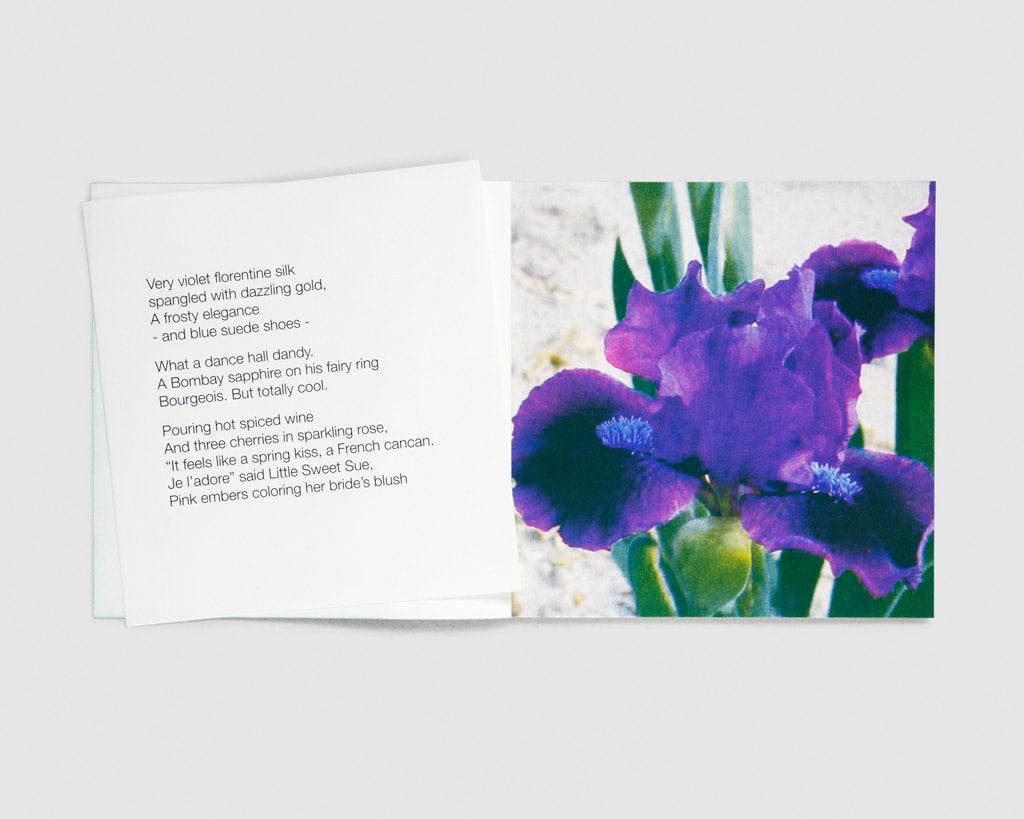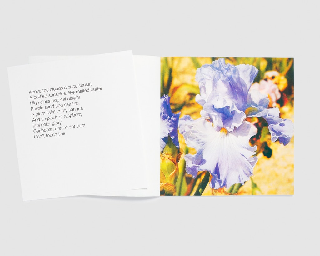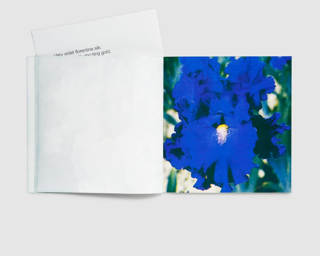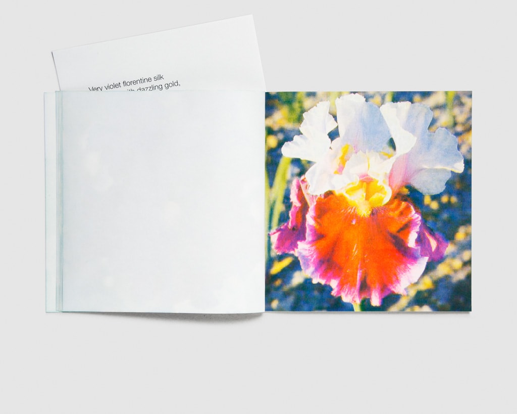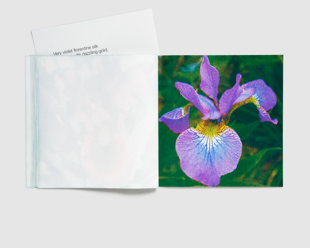 The individual pictures of iris blossoms are collected online by the Paris-based artist and filmmaker. Spread over three booklets with an accompanying poem, each image represents a verse in the order of its appearance. A poem as a publication. A publication as a poem.